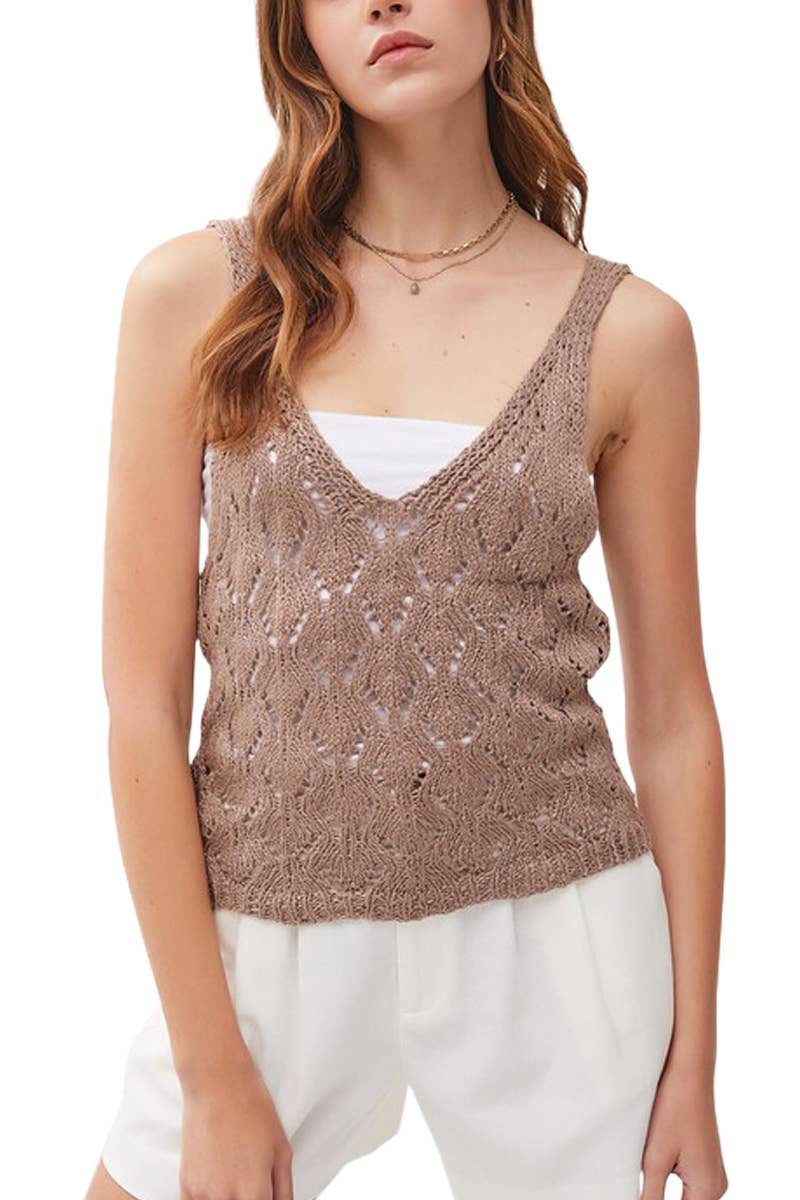 DÉBARDEUR À ENCOLURE RONDE EN CROCHET POUR LE PRINTEMPS TISSU : CROCHET 60% COTON 40% ACRYLIQUE - nouvelles arrivées, nouveau 2025, basique actif, actif USA, débardeur, été, printemps, haut sans manches, bretelle réglable, incontournable, essentiel, haut en crochet