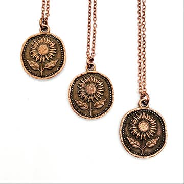 Un magnifique médaillon de tournesol pour une âme brillante Fabriqué à partir d'argent fin 999, le tournesol est écrasé dans l'argile métallique, cuit, oxydé, puis poli. Chaque médaillon contient environ 12 g d'argent. S'accroche à une chaîne serpent en argent sterling.