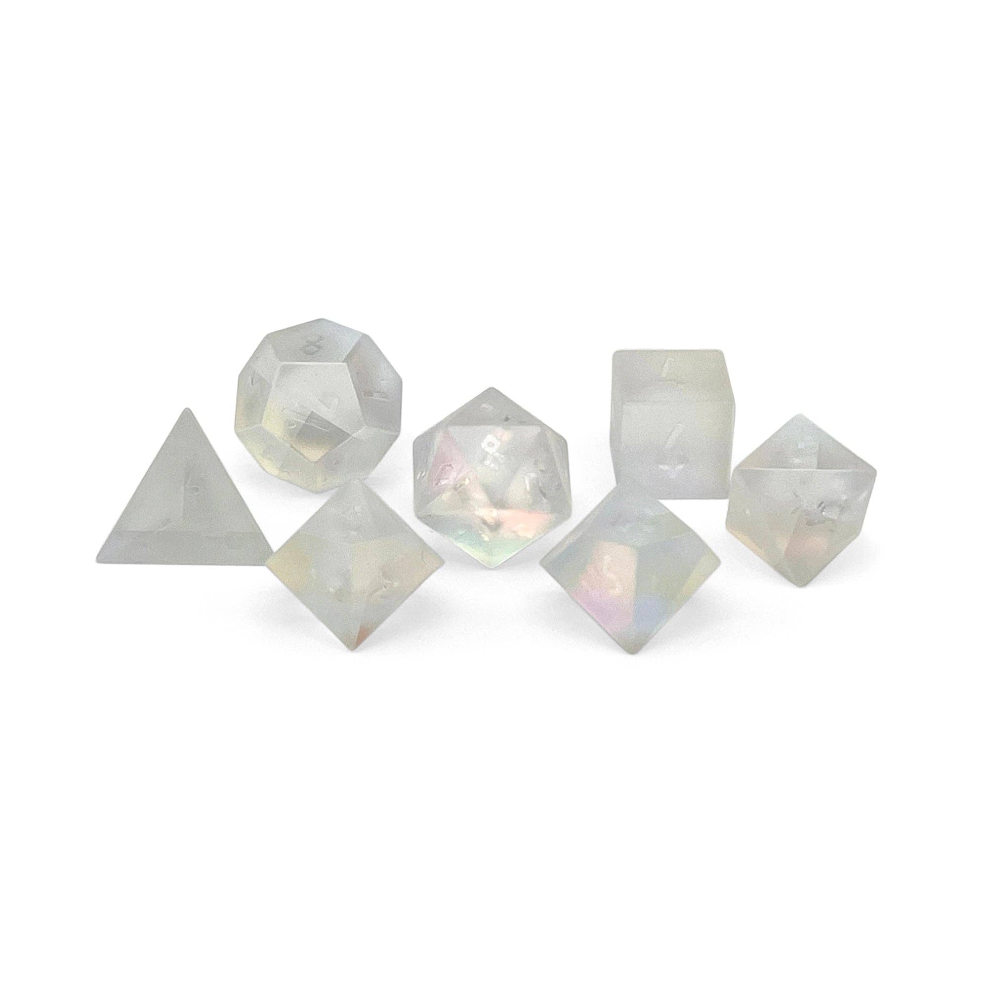 Adoptez la puissance de la Malachite (composite). En tant que véritable explorateur de donjons elfique, vous avez besoin de quelque chose qui reste fidèle à vos origines. Rempli de stries vertes et noires, ce minéral préhistorique donne à votre ensemble de dés un aspect parfaitement surnaturel. Taillé et poli à la main, chaque dé présente des chiffres blancs éclatants qui se démarquent de tout autre ensemble que vous possédez. Parfait pour vos aventures. Traversez toutes vos campagnes et fléaux en donnant vie à chaque personnage et en ajoutant à leurs compétences et forces. Possédant plus de puissance que les armes et outils ordinaires, votre personnage s'élancera à travers toute conquête, qu'il s'agisse d'orques maléfiques ou de monstres diaboliques. Ce produit est fabriqué par un professionnel qualifié, mais en raison de la nature des matériaux naturels, l'article étant taillé à la main et sablé, veuillez prévoir de légères variations dues à la nature de ce produit. Pour les instructions sur l'entretien de votre pierre précieuse, cliquez ici. Magnifiquement taillé à la main. Fabriqué en Malachite (composite), chaque dé possède un charme unique. Design luxueux. Soigneusement taillés et polis, ces dés polyédriques imprègnent des teintes vertes fondues avec des gravures de chiffres dorés. Ensemble de 7 pièces. L'ensemble comprend 7 dés polyédriques (d20, d12, 2x d10 (00-90 et 0-9), d8, d6 et d4). Commencez votre aventure. Idéal pour tous les jeux de rôle (RPG) y compris Donjons et Dragons, Pathfinder, Savage Worlds, GURPS, Hackmaster, et plus encore. Ce produit est fabriqué par un professionnel qualifié, mais en raison de la nature des matériaux naturels, l'article étant taillé à la main et sablé, veuillez prévoir de légères variations dues à la nature de ce produit. Pour des demandes spéciales, ajoutez le service White Glove. Pour les instructions sur l'entretien de votre pierre précieuse, cliquez ici. Boîte à dés non incluse avec l'achat. Matériau de la pierre : Malachite (composite) Dureté Mohs : 4 Lieu de découverte : Arizona, Australie, Égypte, France, Israël, Russie Couleur : Noir, Vert, Vert menthe Remplissage des chiffres : Or Taille : Environ 16-22mm Entretien approprié : Les pierres précieuses sont susceptibles de s'ébrécher et doivent toujours être lancées sur un plateau lisse ou rembourré (exemple : plateaux à dés). Évitez de les lancer sur des surfaces dures. Motif unique : Comme pour toutes les pierres précieuses artisanales, chaque ensemble aura un motif, une variation, une taille, une forme, une coloration, des variantes et des placements de chiffres uniques.