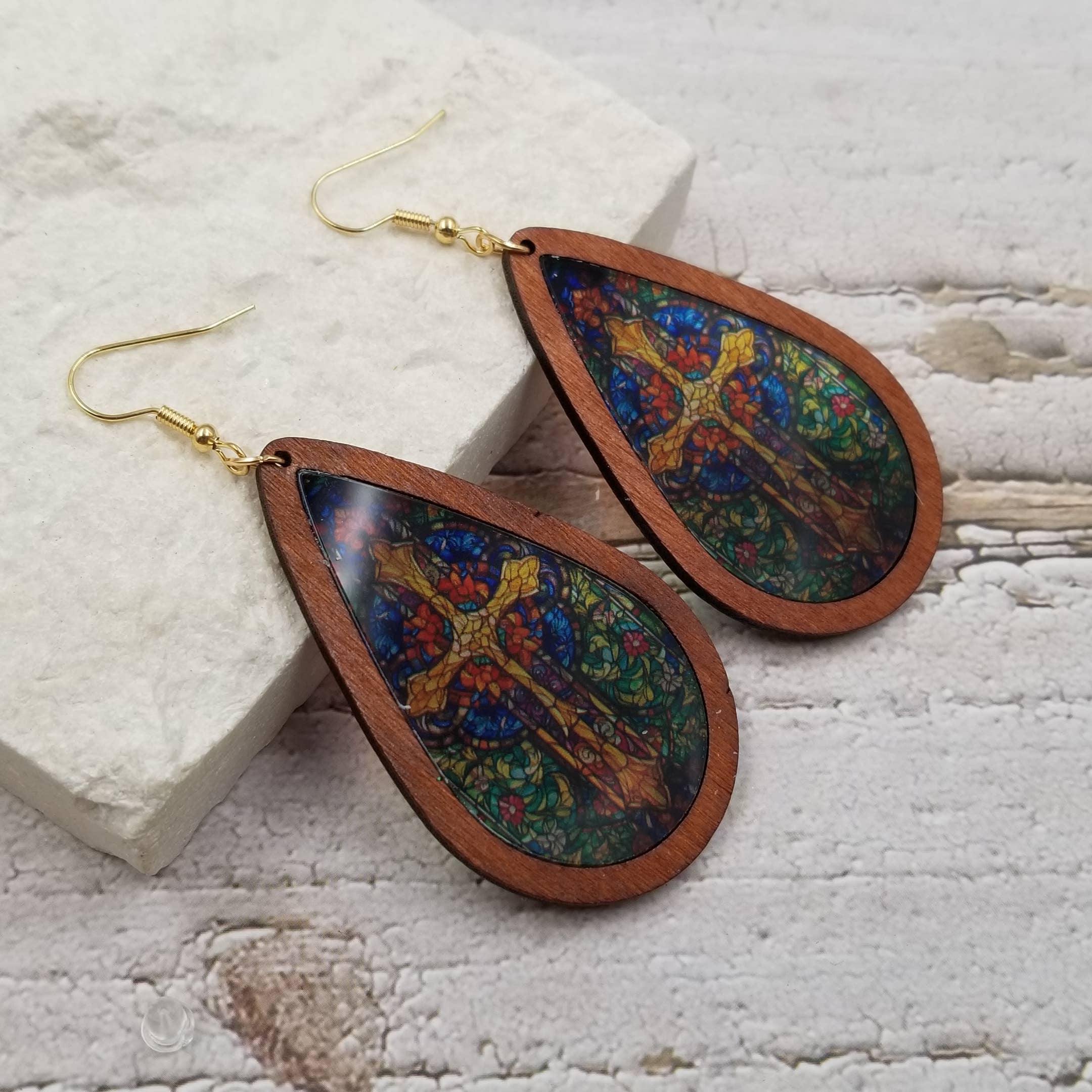 Ces ravissantes boucles d'oreilles présentent une scène de grue japonaise vintage, dans des tons de beige et de bleu sarcelle. Fabriquées à partir de bois dur nord-américain issu de sources durables et finies avec de la résine à base de soja sans BPA/COV, ces boucles d'oreilles éclatantes apporteront joie et éclat à n'importe quelle garde-robe. Câbles auriculaires dorés fabriqués à la main. Environ 2,25 pouces de long.
