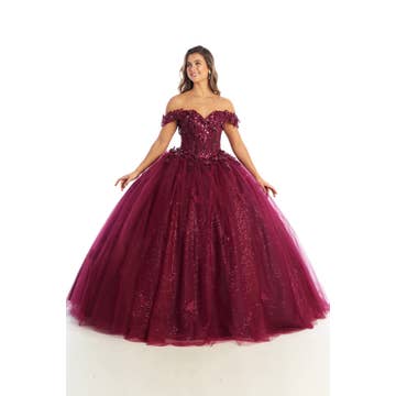 Robe de quinceañera à épaules dénudées avec appliques en dentelle ornée, corset au dos et jupe ample.
