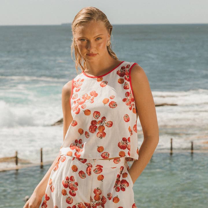∙ TFE11497 ∙ Rayonne/Lin ∙ 6:8:10:12:14=1:2:2:2:1 ∙ Imprimé exclusif ∙ Col à col ∙ Manches courtes ∙ Boutonné à l'avant ∙ Longueur aux hanches ∙ Taille haute ∙ Taille élastiquée avec lien ∙ Poches latérales ∙ Coupe décontractée ∙ Notre modèle porte la taille 8