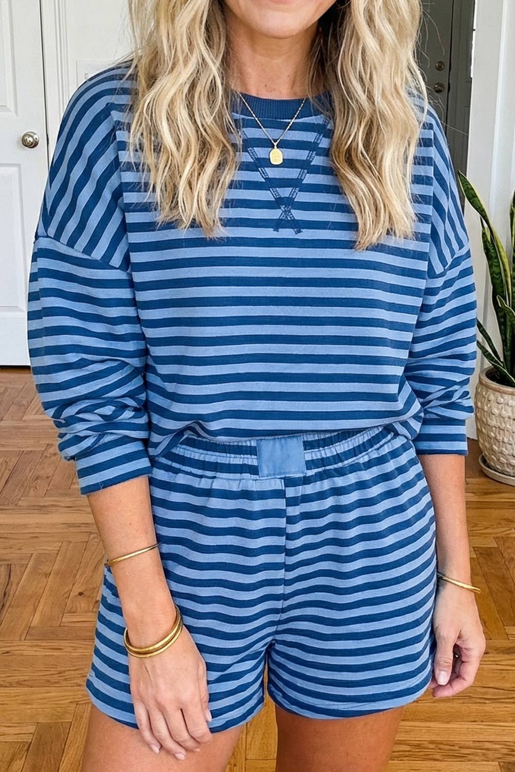 Haut ample à rayures à manches longues et col rond avec pantalon à jambes larges