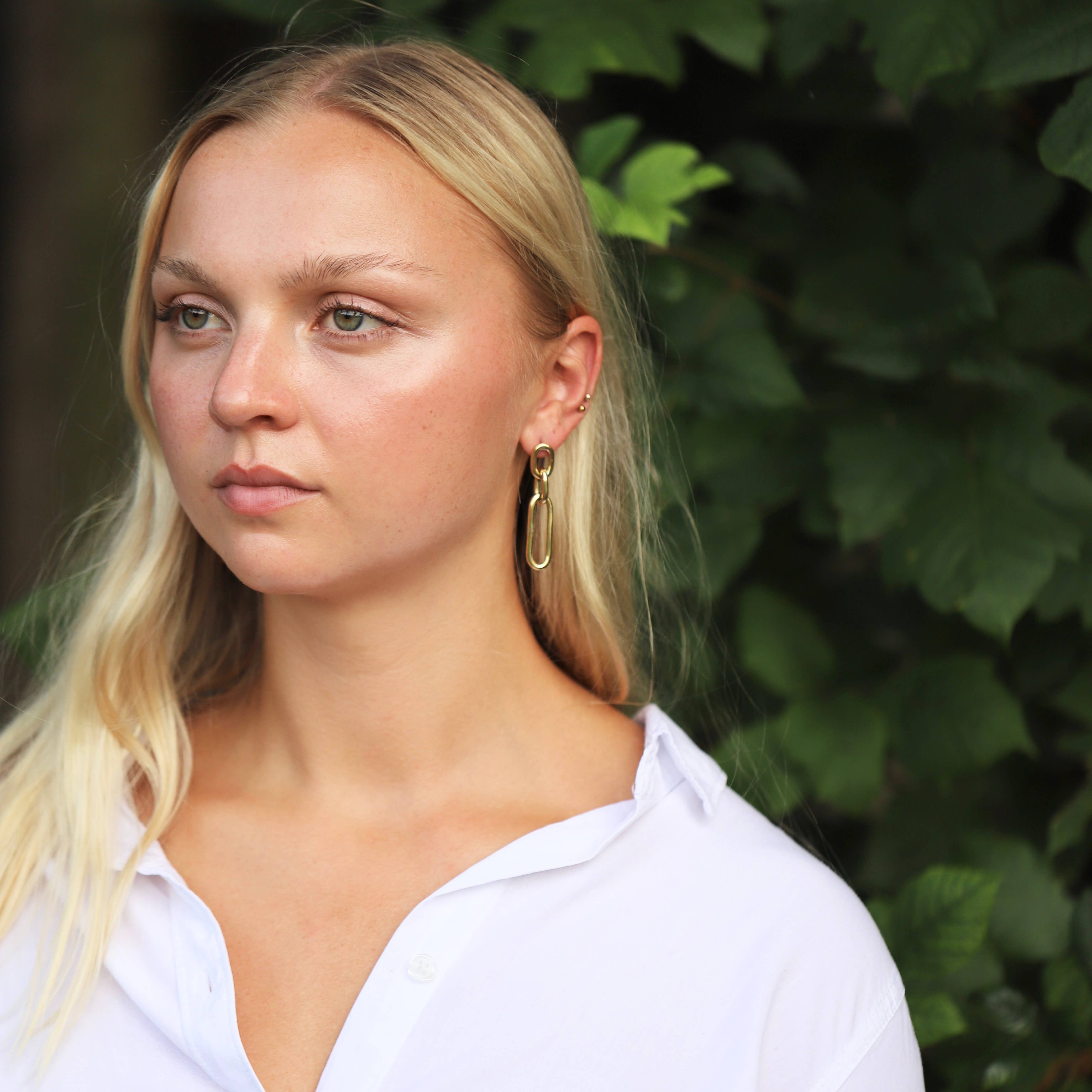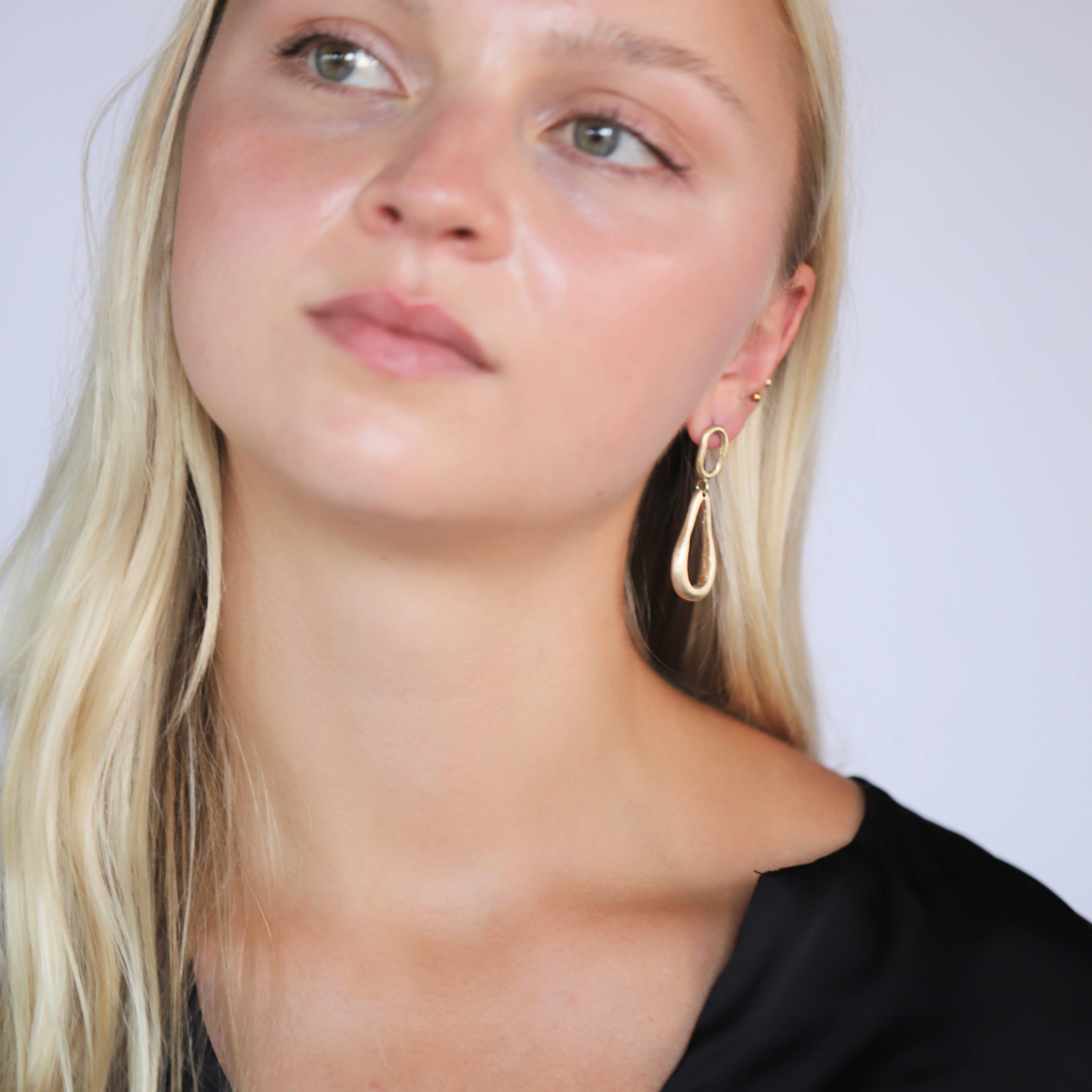 Boucles d'oreilles en laiton massif moulées à la main aux formes organiques. Tous les matériaux sont bruts, recyclés et d'origine locale au Kenya. Le laiton peut naturellement s'oxyder ou se ternir avec le temps. Pour préserver son éclat naturel, nettoyez-le délicatement avec un vernis pour laiton et un chiffon.