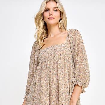 Mini-robe décontractée à imprimé floral avec doublure intérieure. Caractéristiques : taille normale, standard, jeune contemporaine, florale, fleurie, mini-robe, robe courte, robe décontractée, robe d'été, encolure en cœur, smocké dans le dos, manches 3/4, manches courtes, doublure, mignonne, mode, tendance, élégant, à porter au quotidien, look date, vêtements de pique-nique, vêtements pour femmes, vêtements pour femmes, vêtements de transition, automne, hiver, printemps, été, fw, ss