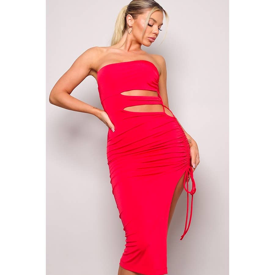 -Tissu spandex solide en rayonne épaisse -Col montant -Sans manches -Dos lacé sur le côté -Mini-jupe doublée dans le même tissu sur la partie avant -Fabriqué aux États-Unis