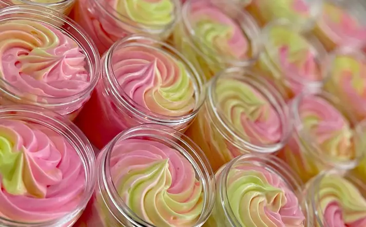 -Vous obtiendrez 24 contenants de 2 oz de beurre corporel. ***Pendant les mois d'été, le beurre corporel fouetté peut arriver légèrement plus mou que lors de son expédition. Veuillez réfrigérer votre beurre pendant 5 à 10 minutes pour qu'il revienne à son état normal.*** Cela n'affecte pas la qualité de nos produits. Vous pouvez réfrigérer votre beurre corporel et vos gommages corporels avant de les ouvrir pour vous assurer qu'ils sont plus fermes. Ingrédients biologiques à cent pour cent entièrement naturels. Ceci est destiné à un usage externe uniquement, veuillez ne pas l'utiliser en interne ou l'ingérer du tout. Tenir hors de portée des animaux domestiques et des jeunes enfants. Vous devriez consulter si vous êtes enceinte, allaitez ou si vous avez des allergies aux noix. Ingrédients : beurre de karité, huile d'amande, arrow-root, huile de tournesol, huile parfumée, poudre de mica coloré