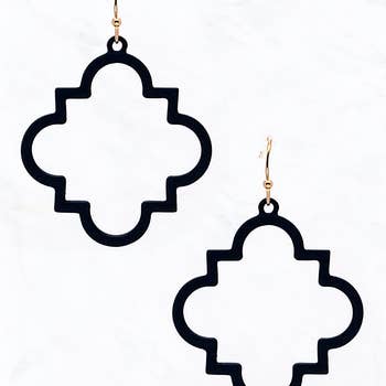 Boucle d'oreille en résine composée d'un trèfle géométrique ouvert et ornée d'un dos montant et de détails en métal doré 18 carats. Ce style est présenté dans le numéro de printemps de The Pioneer Woman. -Retour par la poste -Matières premières pures Longueur : 2 po -1,5 pouces de largeur -Conforme au nickel et au plomb (hypoallergénique)