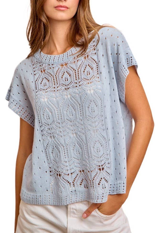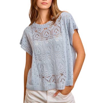 Haut en tricot à manches courtes avec papillon patché en crochet Papillon patché Découpe T-shirt à col rond Couleurs disponibles - Denim chiné, Gris chiné, Taupe chiné Le modèle porte la taille "PETIT" Taille 5' 10" Buste 32'' Taille 24" Hanches 38