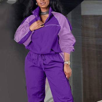 Ensemble de survêtement comprenant un pull court à manches longues avec col, et un pantalon droit, le tout en couleurs contrastées.