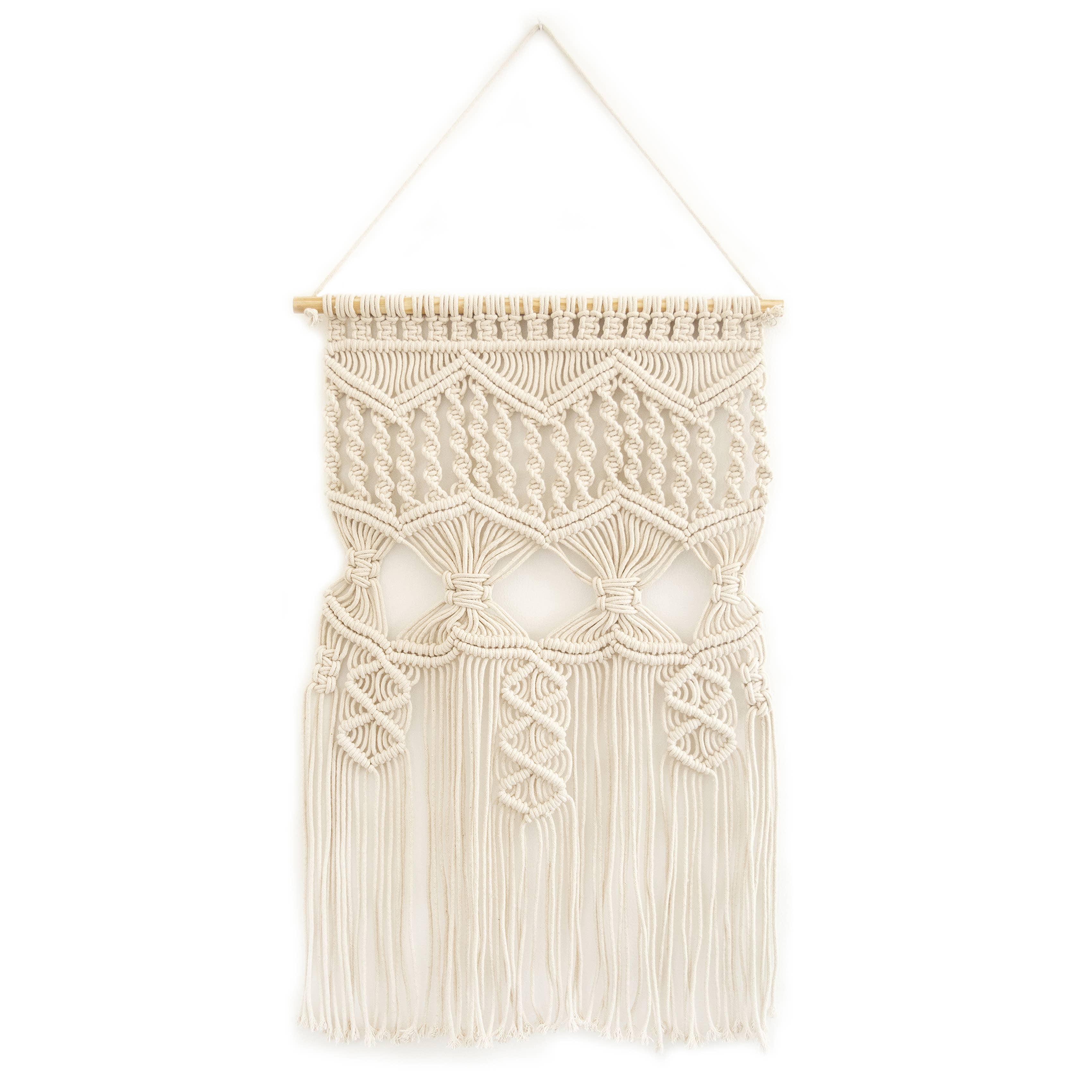 « Les anges ne sont jamais trop éloignés pour entendre vos prières, ils sont toujours à vos côtés, prêts à déployer leurs ailes et à vous apporter réconfort et paix. » Des fibres de coton nouées à la main sont tissées ensemble pour créer cette magnifique esthétique artisanale. Cette décoration murale ajoute de la texture et de la profondeur à n'importe quel espace de vie. • Nom du style : Angel • Fabriqué à la main : 100 % fibres de coton sont nouées à la main pour créer ce superbe motif. Notre macramé contribue à garantir un salaire décent et des options de travail pour les mères. Nos tisserands travaillent à domicile selon leur propre horaire. Ce sont des experts dans leur métier et sont rémunérés en conséquence. Remarque : le macramé est expédié en rouleau et paraîtra assez salissant à votre arrivée. Vous devrez passer un peu de temps à détacher le dessin du goujon de support. Le processus peut sembler fastidieux, mais soyez assuré que le motif est bien noué et qu'il ne se détachera pas pendant le déroulement.
