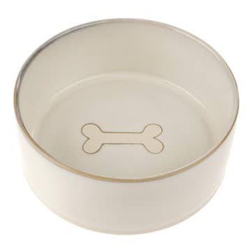 Un bol pour animaux de compagnie conçu pour compléter la décoration intérieure moderne ! Cette gamelle pour chien de taille moyenne présente une glaçure ivoire mouchetée mate, une icône en os en relief sur la paroi intérieure et des bords en grès apparents. • Peut contenir environ 3,25 tasses • 2,5 pouces de haut x 6,5 pouces de profondeur
