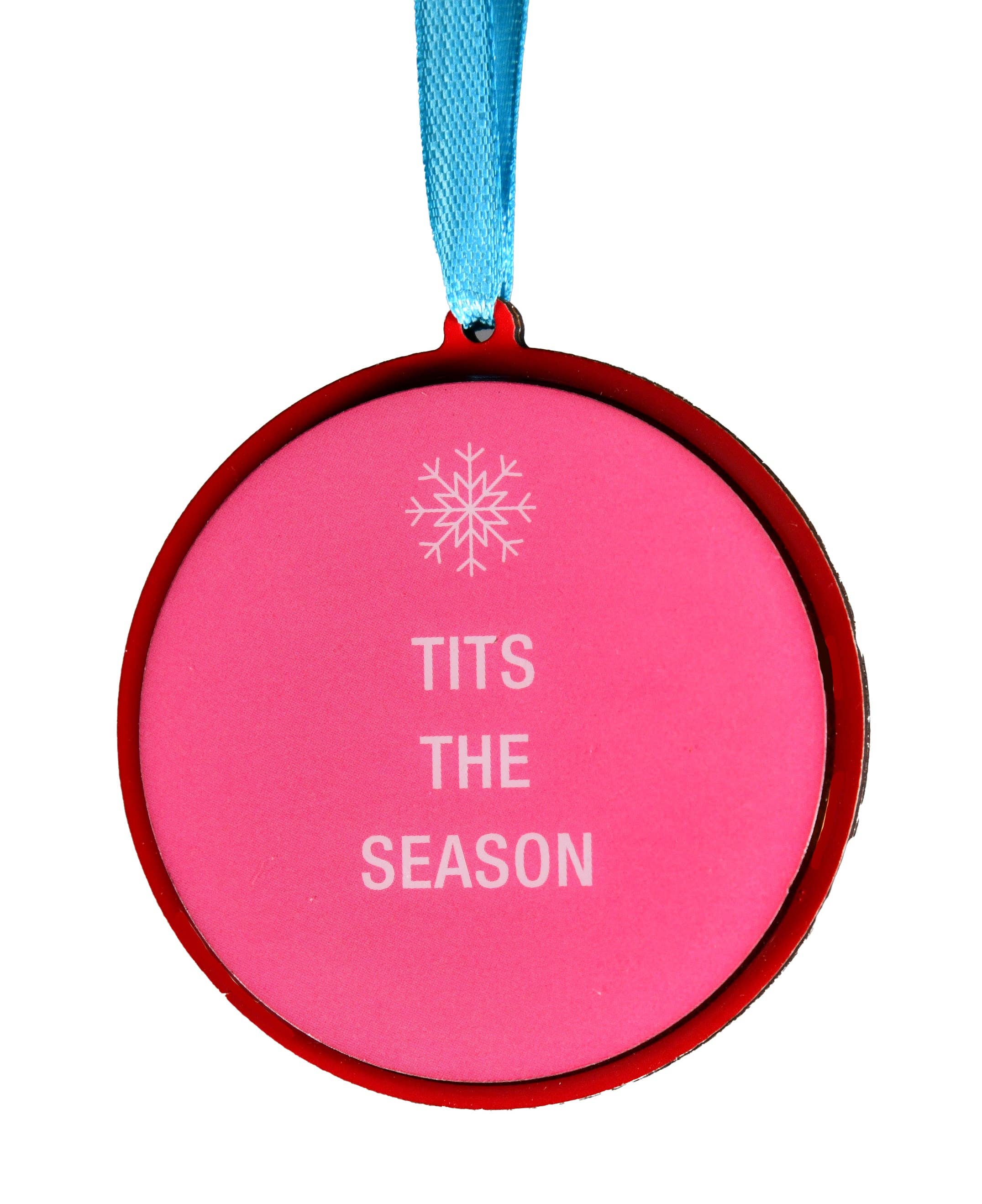Ornement rond représentant un sein, disponible uniquement en rose et noir.