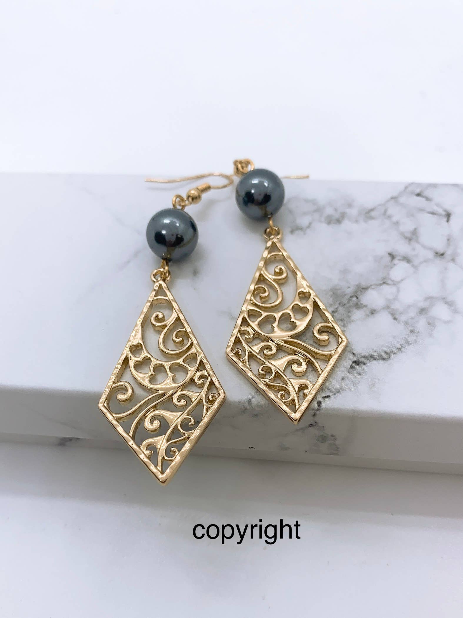 Cœur en émail noir avec fleurs de bambou et d'hibiscus : Boucle d'oreille Hamilton Gold avec perles de coquillage