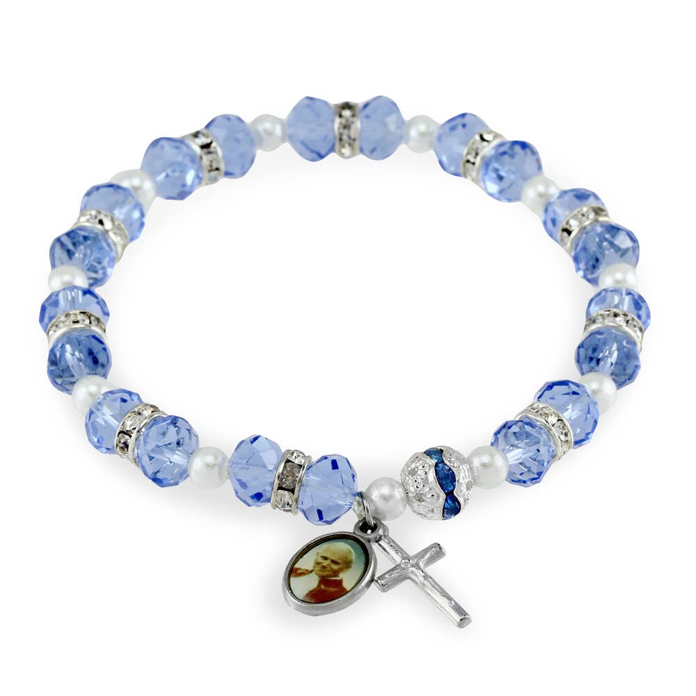 Le bracelet Saint Padre Pio présente une médaille ronde de Saint Padre Pio sur un design extensible avec des perles de 5 mm. Inclut une carte de prière pour la guérison et l'espoir. Disponible en or, argent et canon de fusil. Tailles disponibles : 6,5", 6,85" et 7,5".