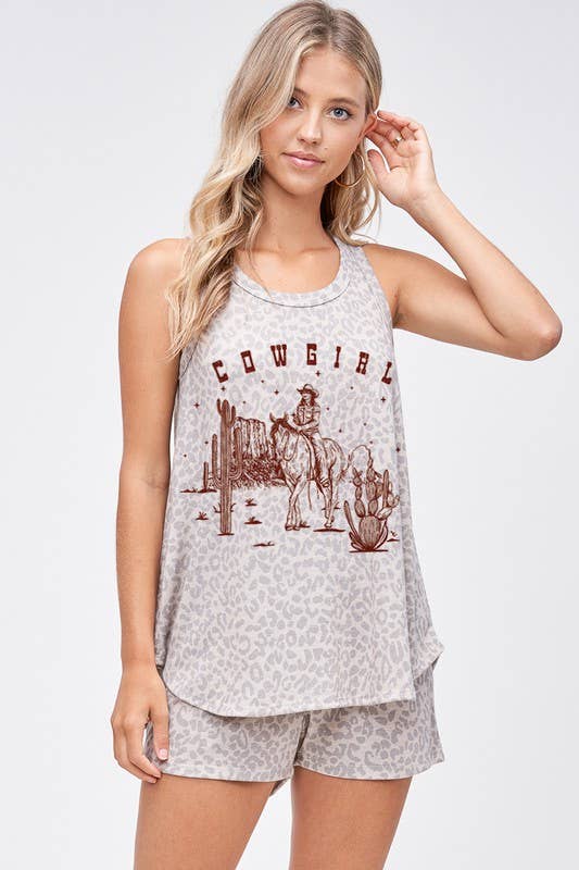 -Ensemble de vêtements de salon à imprimé cowboy du désert -Set assorti -Sleep Lounge Wear -Tissu doux, style décontracté, à porter au quotidien. -Taille du mannequin : Small (5'10" 31- 23-34) -Fabriqué aux États-Unis (WT. 0,5)