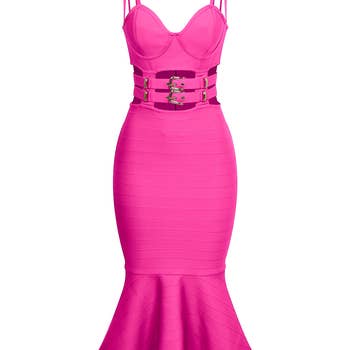 Nous avons tout mis dans cette robe midi moulante à fente haute avec un joint torique et un détail spaghetti.