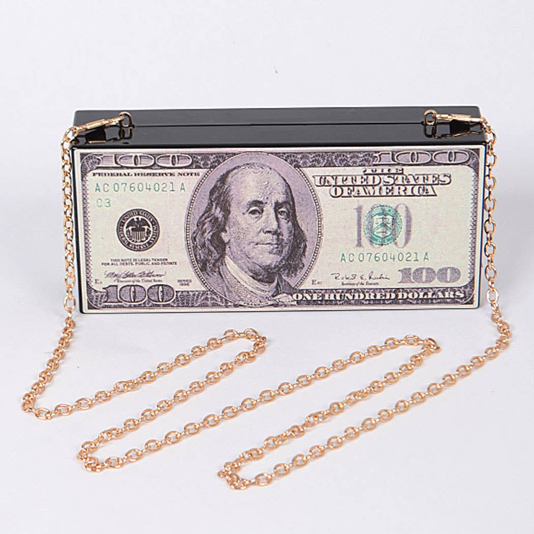 Pochette à bandoulière cylindrique en argent roulé en strass doré avec des détails en argent benjamins à bandes de 10 000$. Fermeture à charnière Kiss Lock. intérieur doublé. Chaîne d'épaule amovible en métal doré incluse.