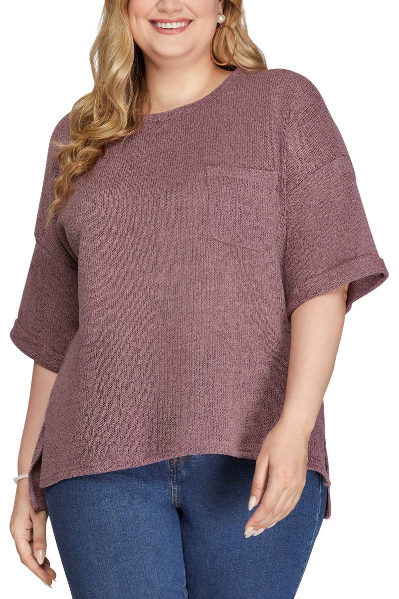 PULL EN MAILLE À MANCHES COURTES EN ALUMINIUM MÉTALLISÉ GRANDE TAILLE AVEC POCHE ET POCHE. 65 % ACRYLIQUE, 35 % NYLON.