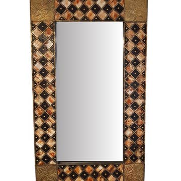 Miroir en fibre rigide orné à la main de fils noirs.