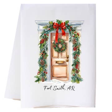 Serviette de cuisine de Noël "Père Noël de la ville personnalisée arrive en ville" en vente B2B