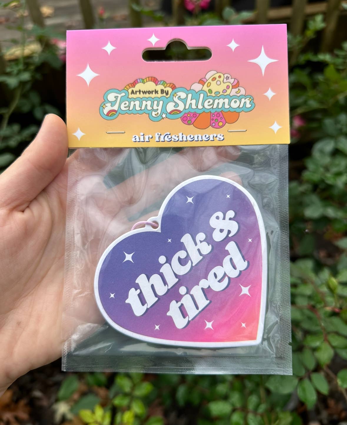 Il s'agit d'un assainisseur d'air parfumé à la rose pour votre voiture. La taille du cœur est de 3 pouces par 3,25 pouces. Il est conçu et fabriqué par Jenny Shlemon. Il est livré dans son emballage. Ça sent bon et ça débarrassera à coup sûr votre voiture de cette puanteur de pet. :')