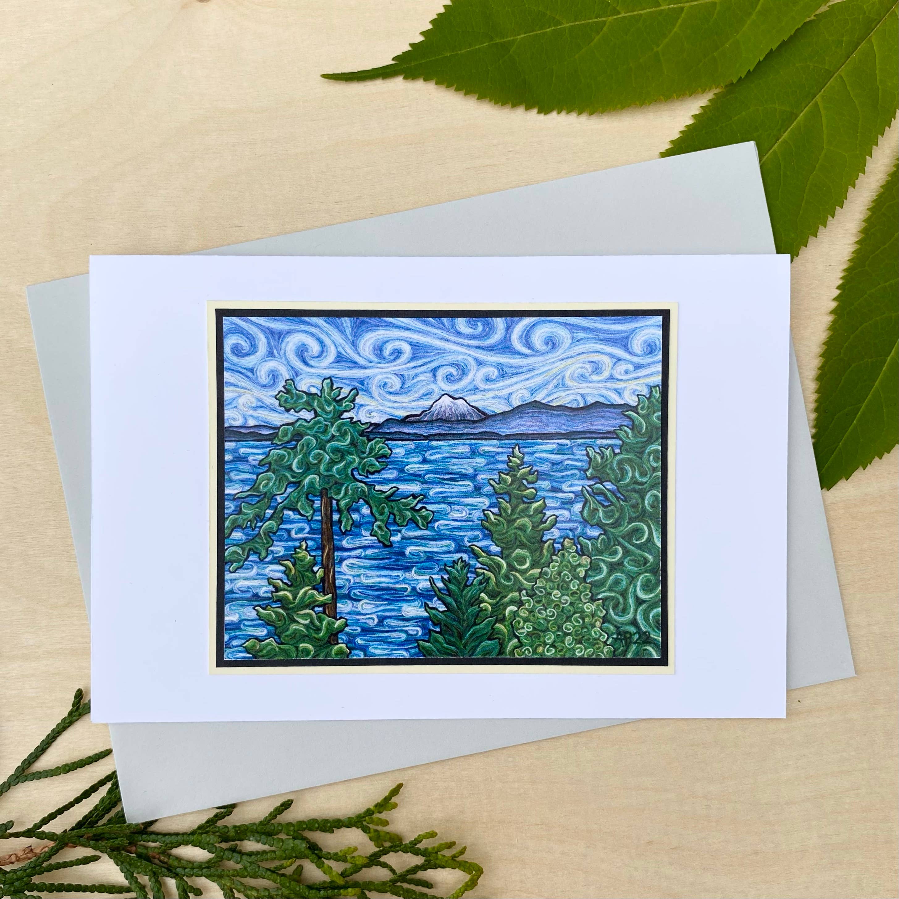 Îles San Juan. Des loutres de rivière prennent une pause sous un pin moussé. Le ferry de l'État de Washington passe. Letterpressed dans plusieurs couleurs qui se chevauchent. Intérieur vierge pour votre propre message. Carte de 6 1/4 « x4 1/4" avec enveloppe à rabat carré A6 standard assortie.