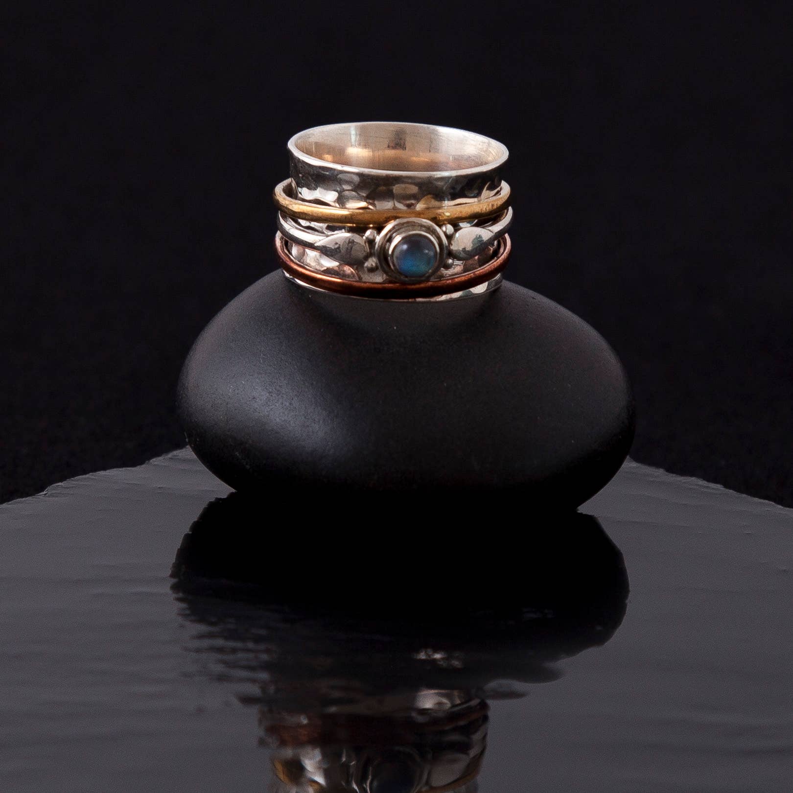Bagues en argent patiné dans une boîte de présentation en vente B2B