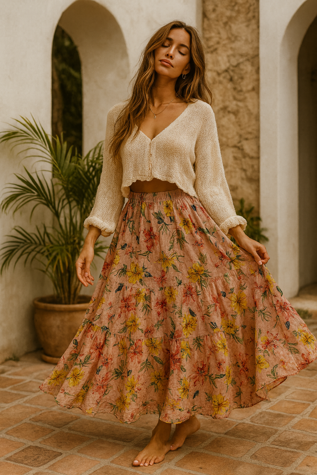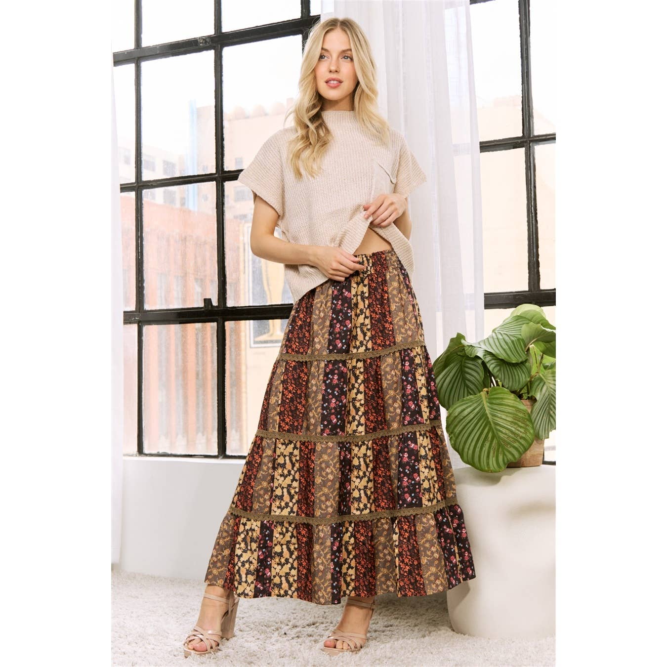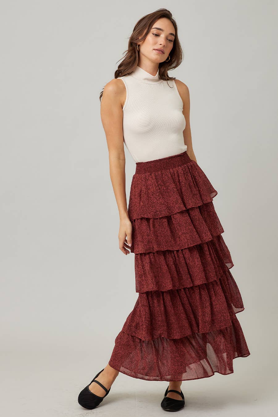 FS5995-P985 Jupe longue à imprimé floral avec niveaux volantés et fermeture à glissière latérale cachée. Doublé. Le mannequin mesure 1,80 m et porte la taille S. Coquille : 98 % polyester, 2 % lurex Doublure : 100 % polyester