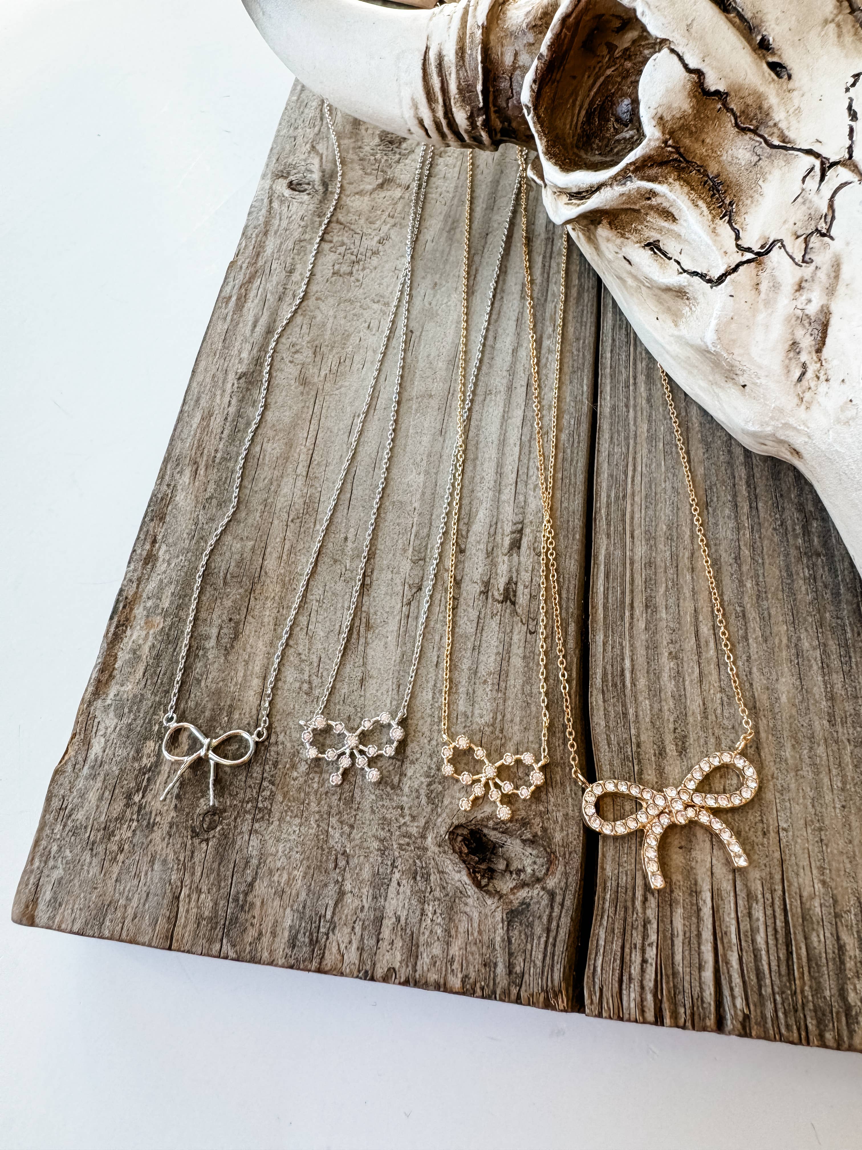 * Collier à ruban en strass * 14,5 pouces environ * Vous pouvez nommer le produit « Collier en diamant avec nœud en strass » pour souligner la combinaison de strass dans l'élégant motif de nœud du collier.