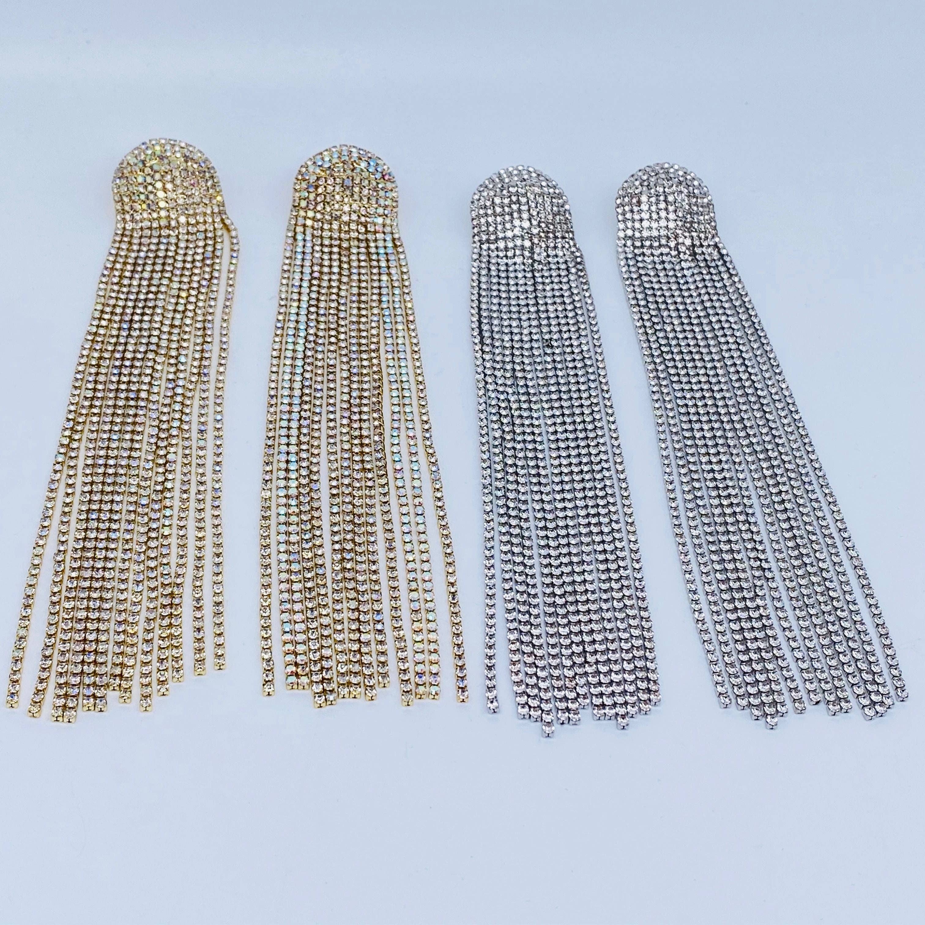 Taille : 0,4" X 16" Retour Conforme au plomb et au nickel Boucles d'oreilles de soirée surdimensionnées avec franges, ornées de cascades de strass scintillants pour un maximum de mouvement et de drame. Conçues pour faire une déclaration audacieuse, ces élégantes boucles d'oreilles sont parfaites pour les occasions spéciales, ajoutant éclat et sophistication à toute tenue formelle.