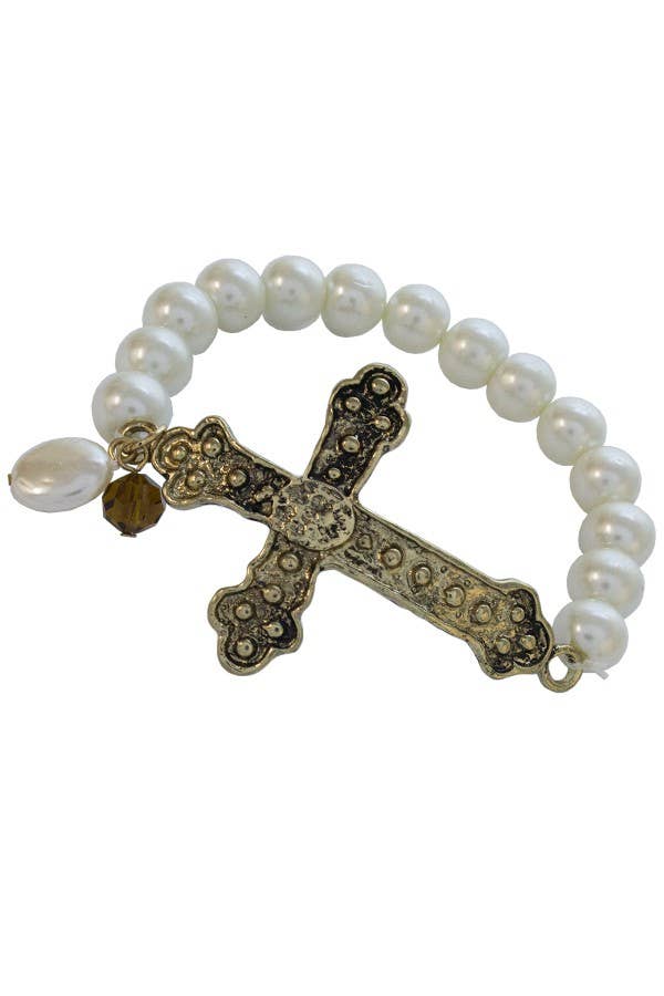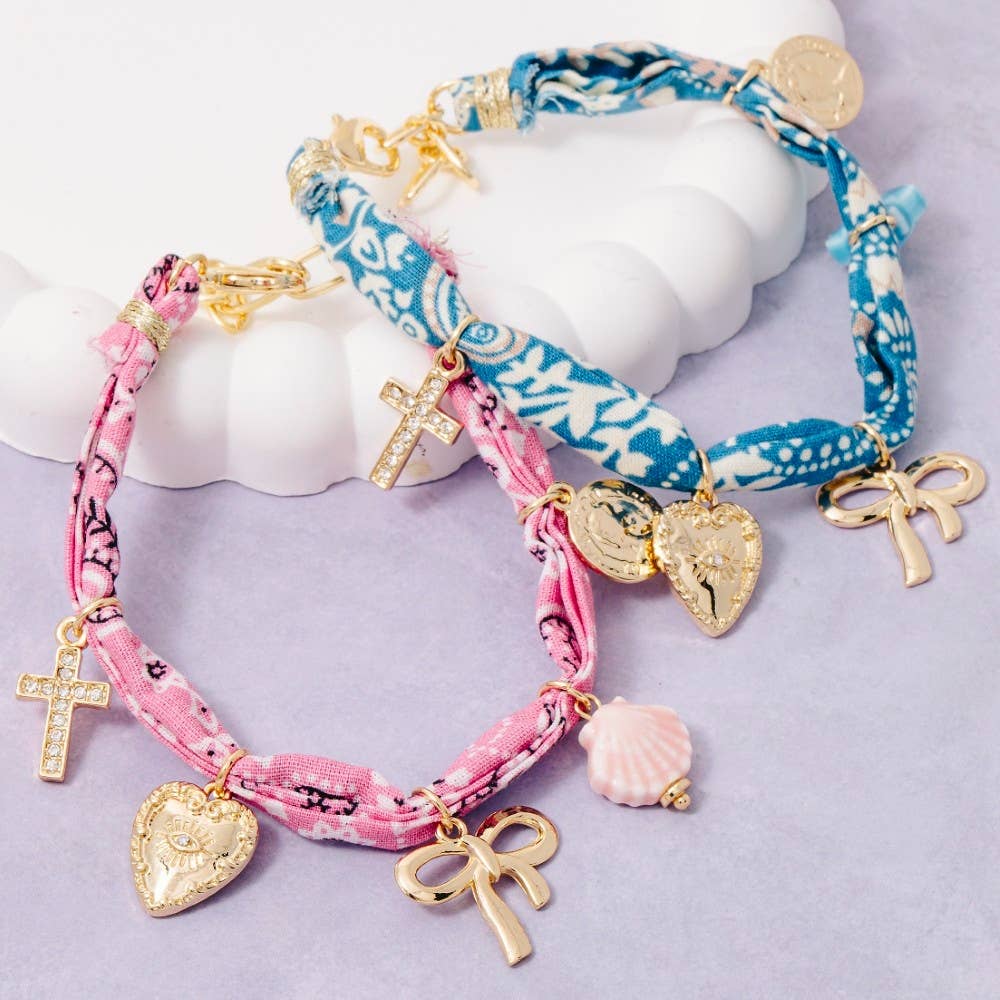 Bracelet noué en denim avec croix, cœurs floraux et breloques de perles en vente B2B