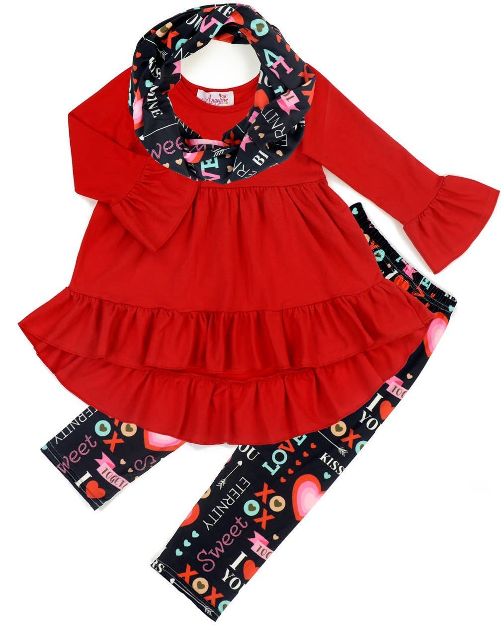 Montrez de l'amour et du style dans cette adorable tenue pour fille comprenant un sweat-shirt confortable à manches à volants avec un motif "Aime comme Jésus", associé à un pantalon évasé chic. Le pantalon bordeaux vif s'évase avec un ourlet à volants ludique, ajoutant une touche tendance à cet ensemble confortable. Parfait pour un usage quotidien ou des occasions spéciales, cet ensemble combine à la fois foi et mode dans un look charmant.