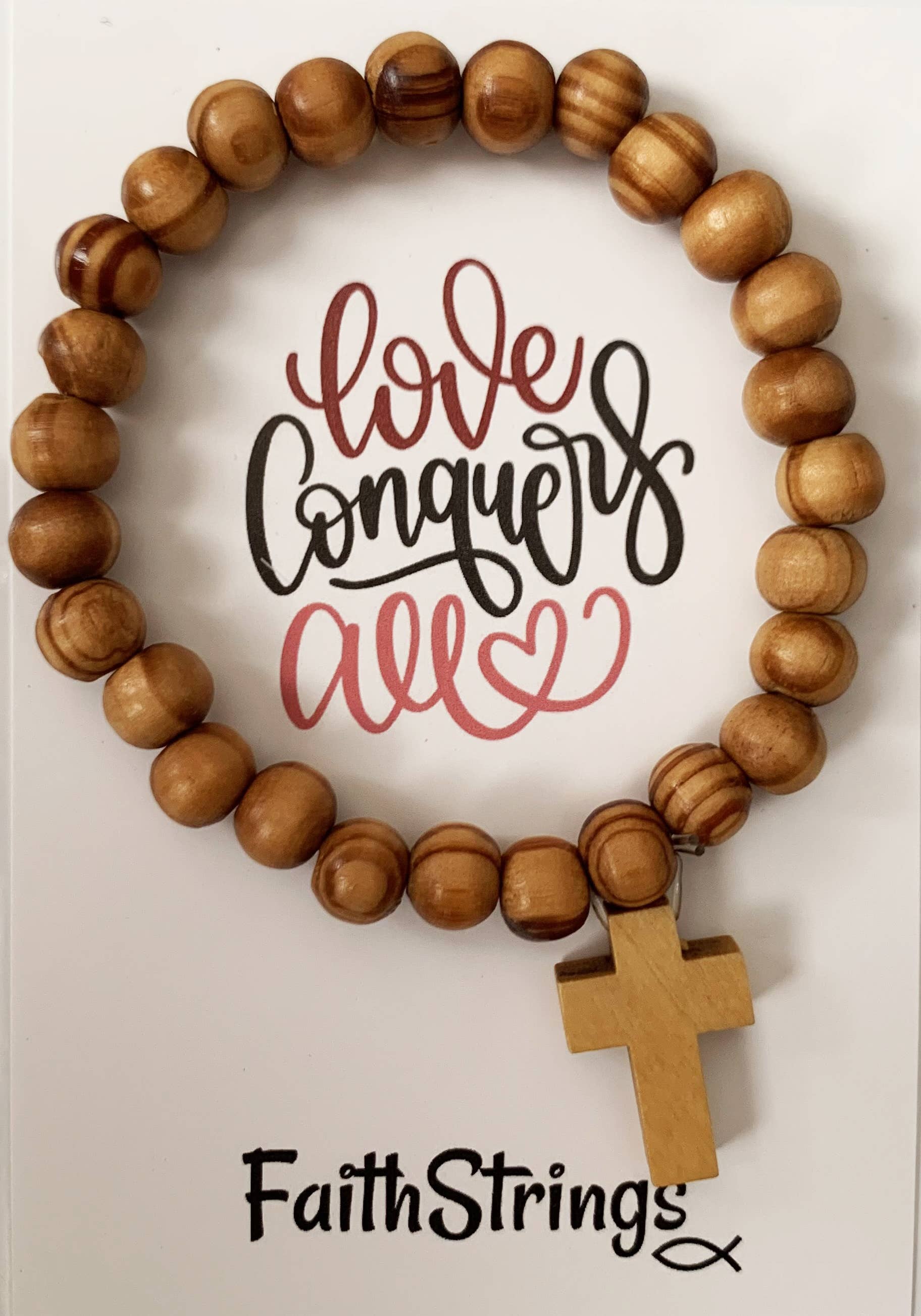 Bracelet extensible avec perles de lave naturelles de la Croix chrétienne. Perles rondes en pierre de lave naturelle de 8,5 mm (0,34 po) avec deux perles turquoises synthétiques. La croix mesure 20 x 15 mm (0,79 x 0,58 pouce). Les cartes de support disent « L'amour conquiert tout » Les bracelets sont emballés dans du cellophane. Un excellent cadeau chrétien à bas prix.