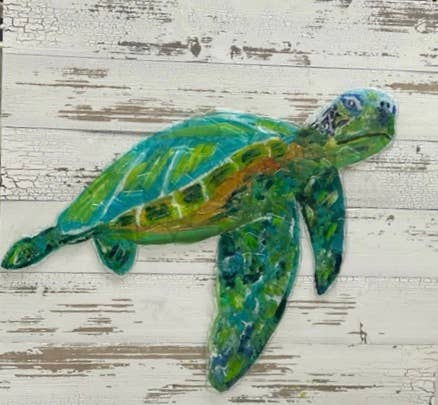 Cet hippocampe fait main, peint et texturé est disponible en deux combinaisons de couleurs : sable blanc ou tropical brillant. Les deux combinaisons de couleurs sont agrémentées de touches dorées et présentent d'épais côtés dorés. La taille est de 4 x 5 pouces. La signature de l'artiste et le nom de l'entreprise sont inclus au dos. Chaque motif étant dessiné et texturé individuellement, chaque bloc est unique et peut légèrement varier.