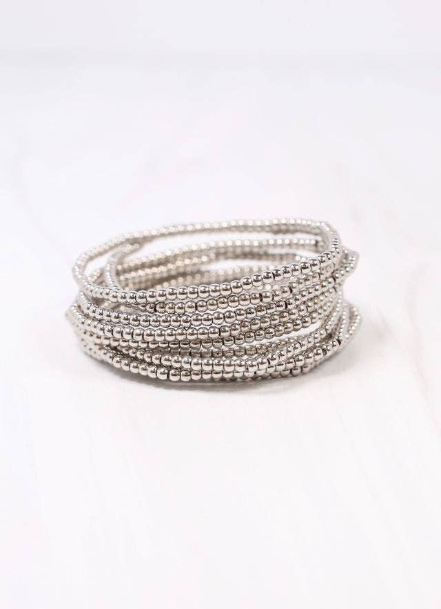 Cet ensemble de bracelets simples comprend trois pièces ornées de perles d'argent et d'accents en forme de croix. Il peut facilement accessoiriser n'importe quelle tenue seul ou dans une pile plus complète.
