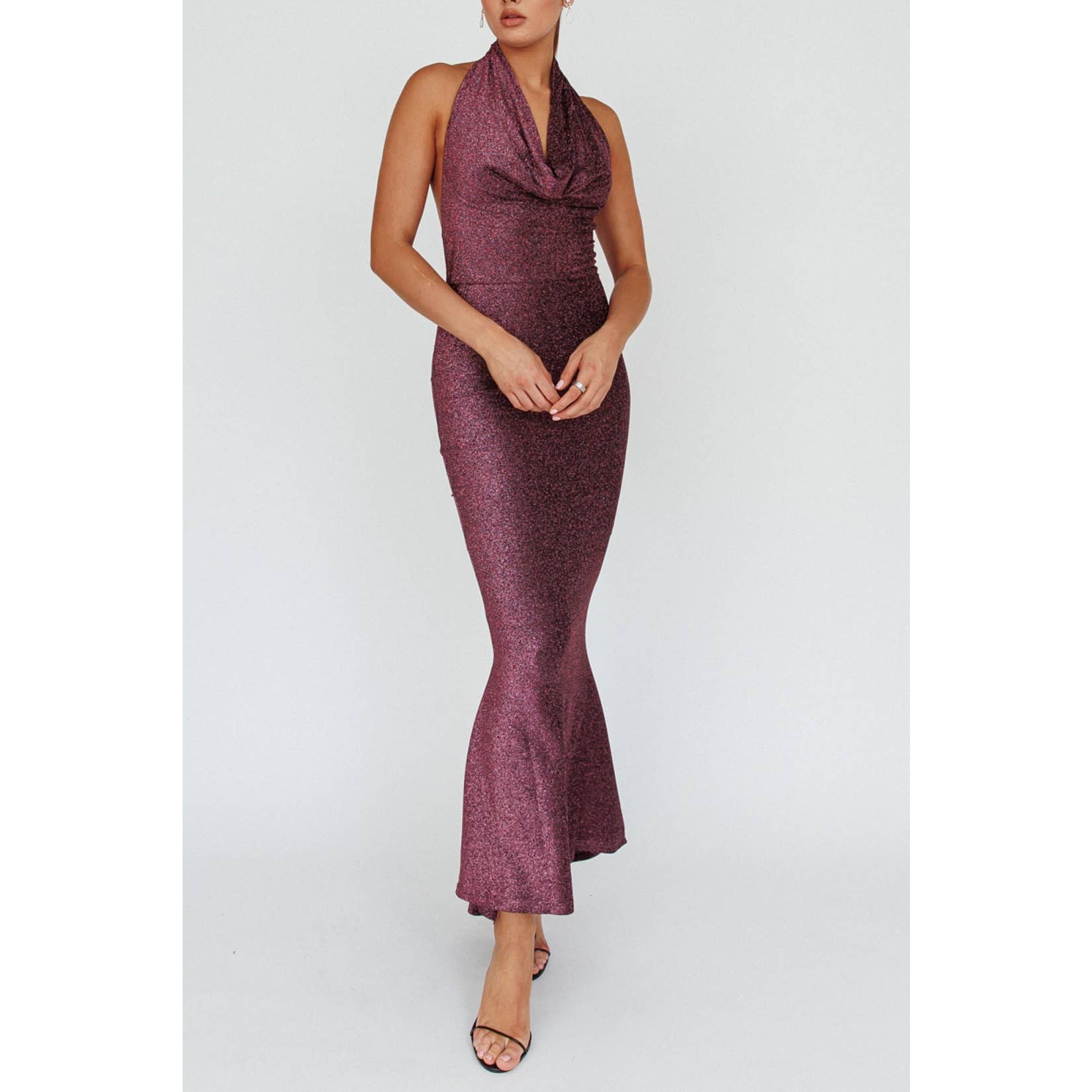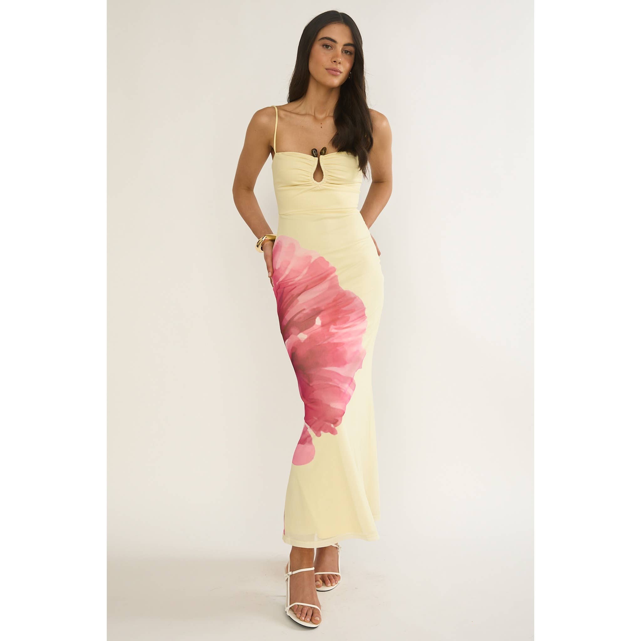 La robe est une longue robe jusqu'au sol avec de fines bretelles réglables. Elle présente un corsage ajusté avec un détail torsadé unique au niveau de la taille, créant une section découpée qui ajoute une touche élégante.
