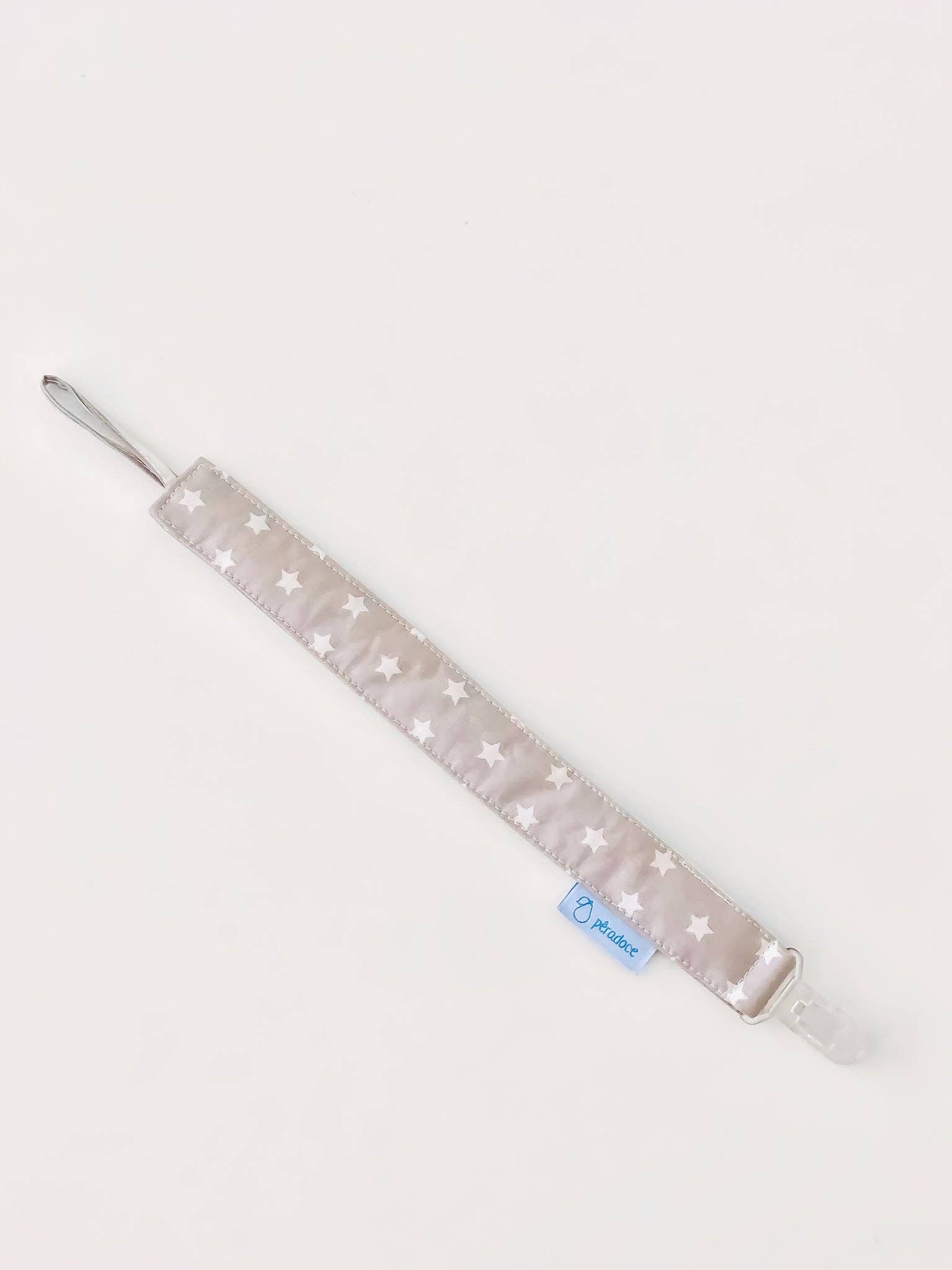 Le ruban attache-tétine mesure environ 30 cm de long et 3 cm de large, il peut être confectionné avec la combinaison de deux tissus et se fixe avec un bouton-pression en plastique transparent.