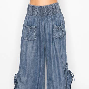 - Pantalon confortable à taille élastique Palazo - Jambe large - Détail froncé (Taille du modèle : 1,73 m, portant une taille Small, ratio de taille 2-2-2, NOUVEAUTÉ) 75% RAYON 25% LINEN