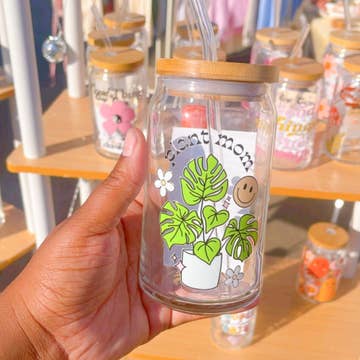 Tasse en verre de 16 oz avec couvercle en bambou In my Auntie Era en vente B2B