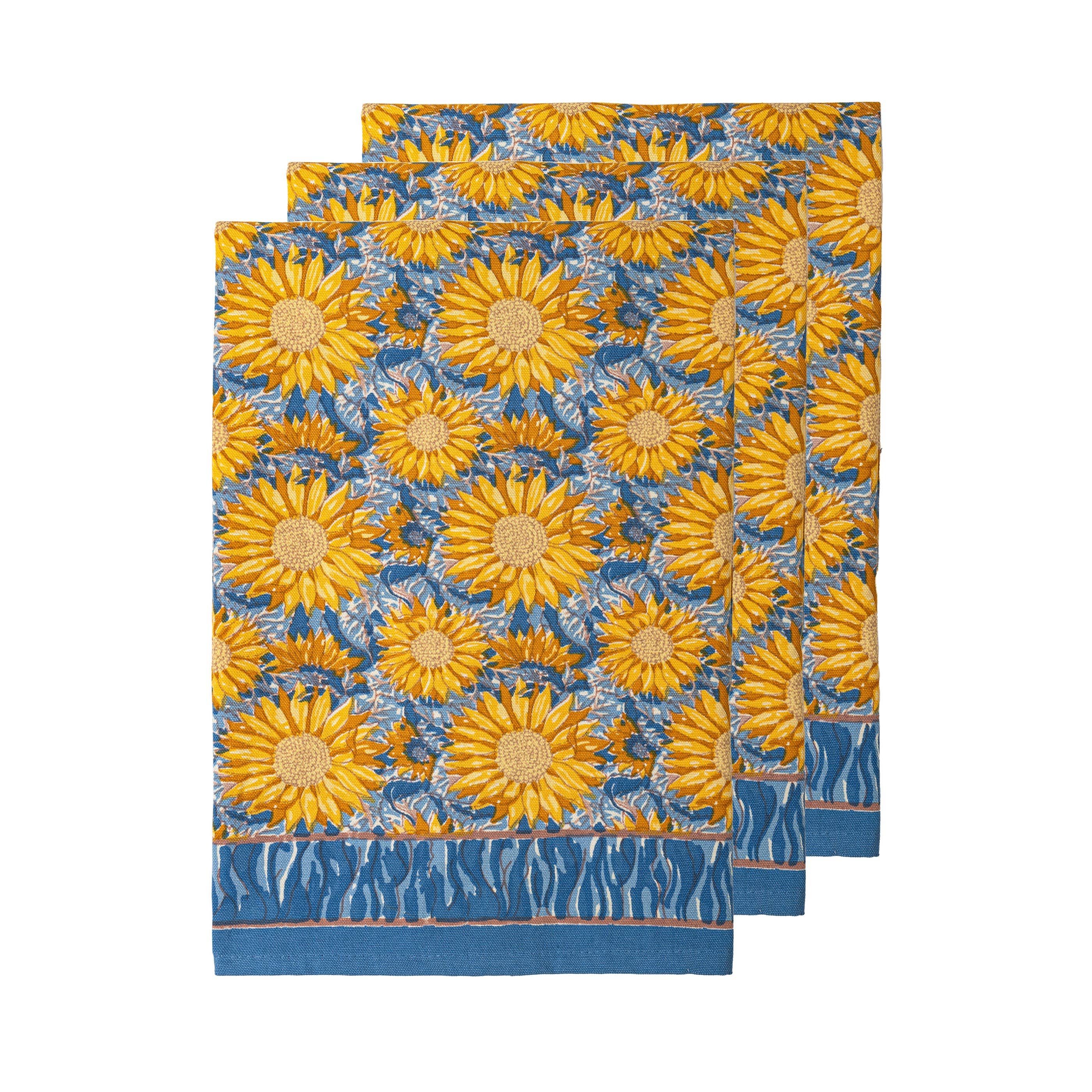 Imprimé tournesol en turquoise et jaune. 100 % coton Taille 48 cm x 76 cm Laver à 40 °C Designer Marie Jangneus