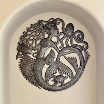 Painted Small Mystery of the Sea est un chef-d'œuvre d'art métallique haïtien unique en son genre, conçu pour une utilisation décorative intérieure et extérieure. Pièce magnifiquement détaillée et peinte de façon vibrante sur le thème de la mer, Painted Small Mystery of the Sea fera sensation dans n'importe quelle maison de plage ou côtière. * Art métallique haïtien certifié par la Fair Trade Federation * Art métallique en acier peint et recouvert d'un vernis protecteur brillant * Dimensions : 18 pouces de long x 18 pouces de large * Fabriqué à la main au Village Artistique de Noailles à Croix-des-Bouquets, en Haïti par des artisans métallurgistes haïtiens Art populaire qui remonte au milieu du 20e siècle, l'art métallique haïtien est aujourd'hui l'art du recyclage et de la transformation de barils de pétrole en acier mis au rebut en œuvres d'art métalliques ornées. En tant qu'art métallique haïtien fait à la main, il y aura de légères variations d'une pièce à l'autre, ce qui ajoutera au caractère et à la valeur uniques de chaque pièce d'art métallique.