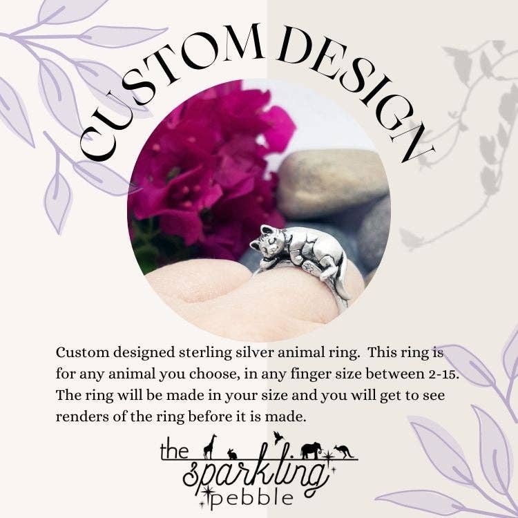 Cette douce petite lapine adorera somnoler sur votre doigt alors qu'elle part à toutes vos aventures quotidiennes avec vous ! Chaque détail est sculpté avec soin. Bague lapin en argent sterling Matériau : argent sterling massif Veuillez sélectionner la taille de votre doigt dans le menu. Si vous ne voyez pas votre taille, nous pouvons toujours la faire pour vous ! Envoyez-nous un message avec la taille de doigt dont vous avez besoin. La livraison de toutes les bagues prend environ 4 semaines. Si un article est en rupture de stock pour le moment, vous pouvez toujours le commander ! Il faudra environ 2 à 3 semaines pour que votre commande arrive, plutôt que les quelques jours nécessaires pour qu'un article en stock arrive. Chaque motif animal de The Sparkling Pebble est sculpté numériquement avec beaucoup de soin.