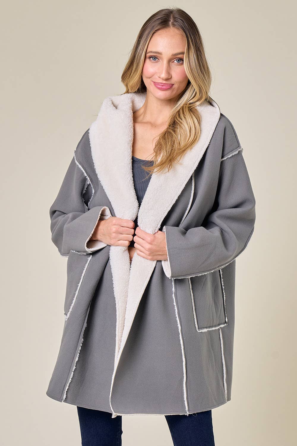 MANTEAU MOELLEUX À CAPUCHE À MANCHES LONGUES DE COULEUR UNIE EN VENTE B2B