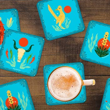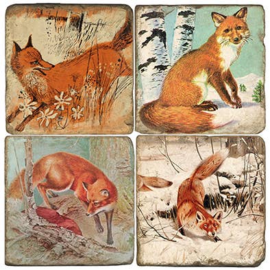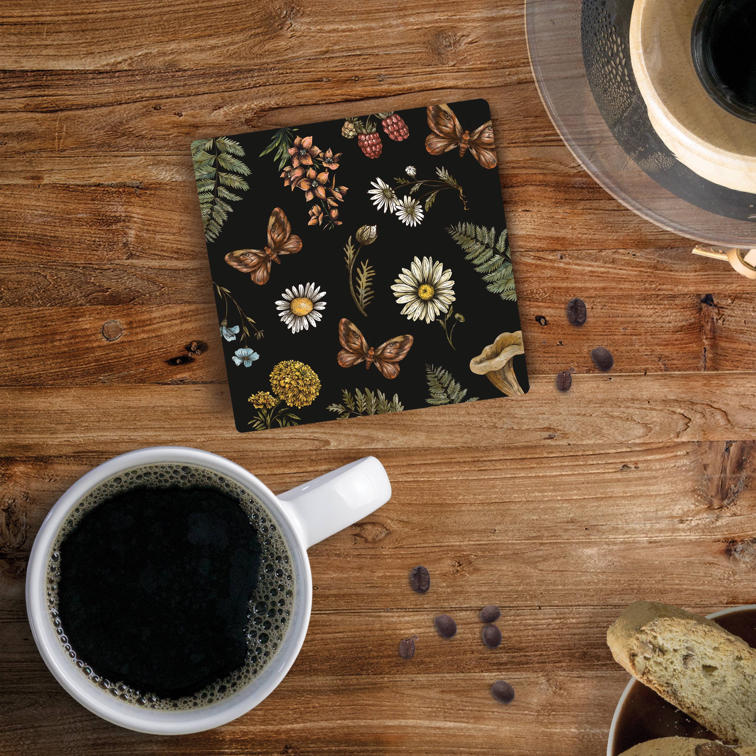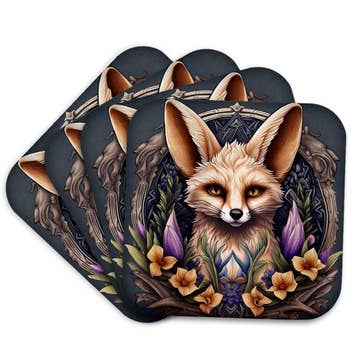 Ensemble de 4 sous-verres en sergé de coton. 2 épaisseurs avec une couche inférieure en serge sèche (mèche et sèche). Décoration imprimée. Lavable en machine.