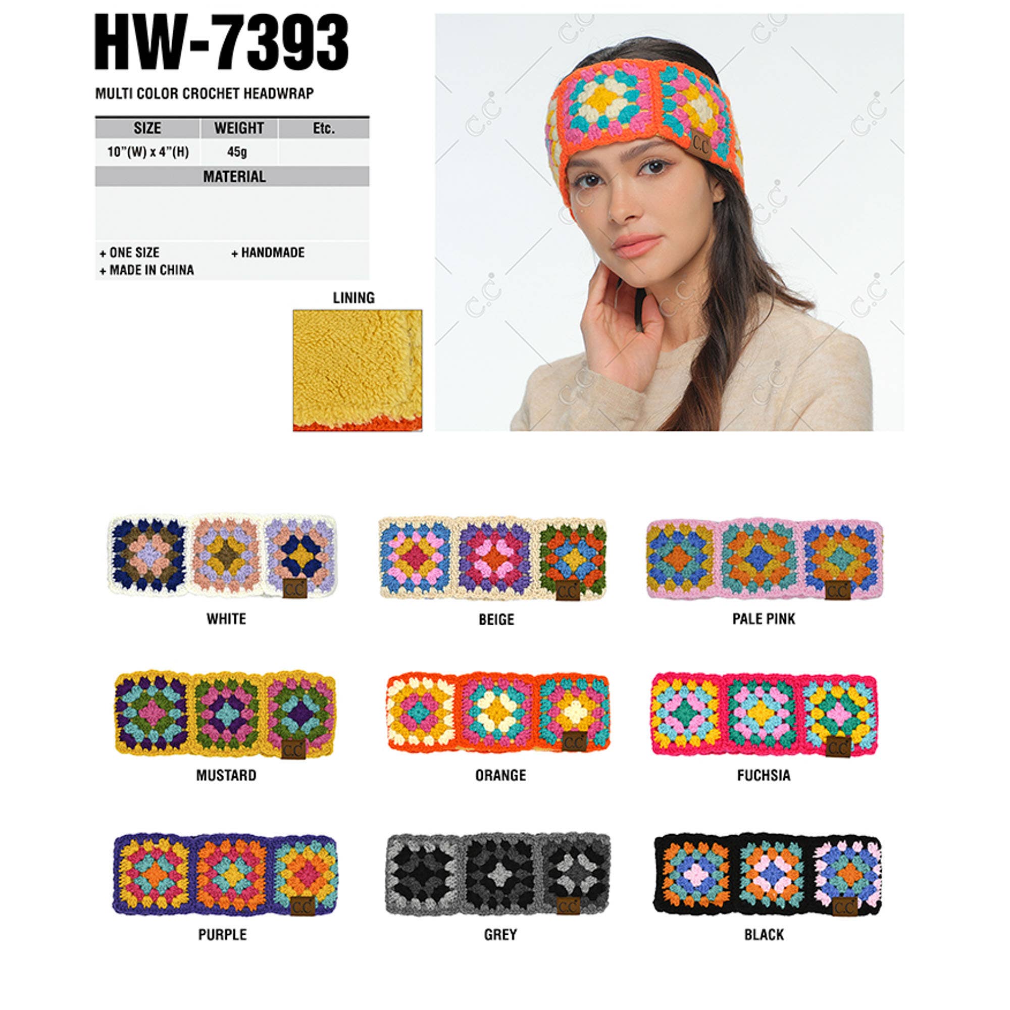 Bandeau fait main au crochet multicolore C.C 100 % acrylique Taille unique (10 « x 4") Fabriqué en Chine