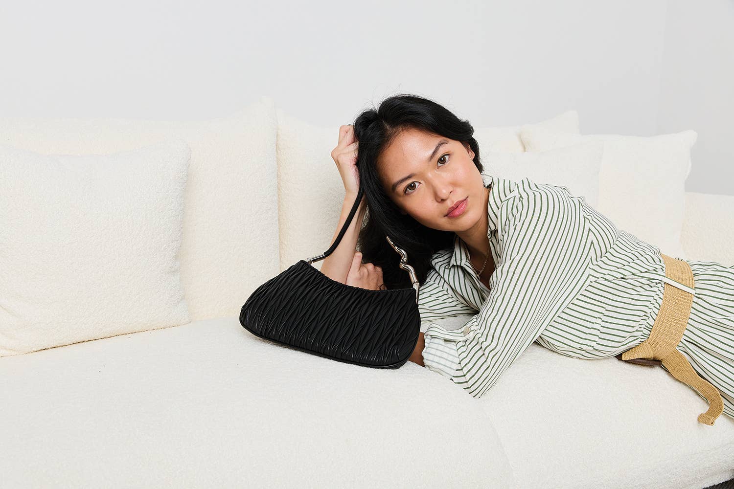 Détails de l'article : -Matériau : Velours côtelé -Fermeture : Fermeture éclair supérieure -Bandoulière : Sangle de guitare réglable/amovible -Poches : Deux poches latérales zippées Dimensions : -Longueur : 31,75 cm -Hauteur : 27,94 cm -Profondeur : 9,53 cm Caractéristiques : -Design décontracté : Offre un look détendu et à la mode. -Matériau en velours côtelé : Ajoute de la texture et de la durabilité au sac hobo. -Sangle de guitare polyvalente : Réglable et amovible, permettant un port confortable et personnalisable. -Fermeture éclair supérieure sécurisée : Assure que vos affaires sont gardées en sécurité. -Poches multiples : Deux poches latérales zippées offrent un espace de rangement supplémentaire pour vos essentiels. -Fonctionnel et élégant : Parfait pour un usage quotidien, alliant praticité et design chic. Collection Automne/Hiver Achetez maintenant et enrichissez votre collection d'accessoires avec le Michaela Slouchy Hobo avec sangle de guitare !