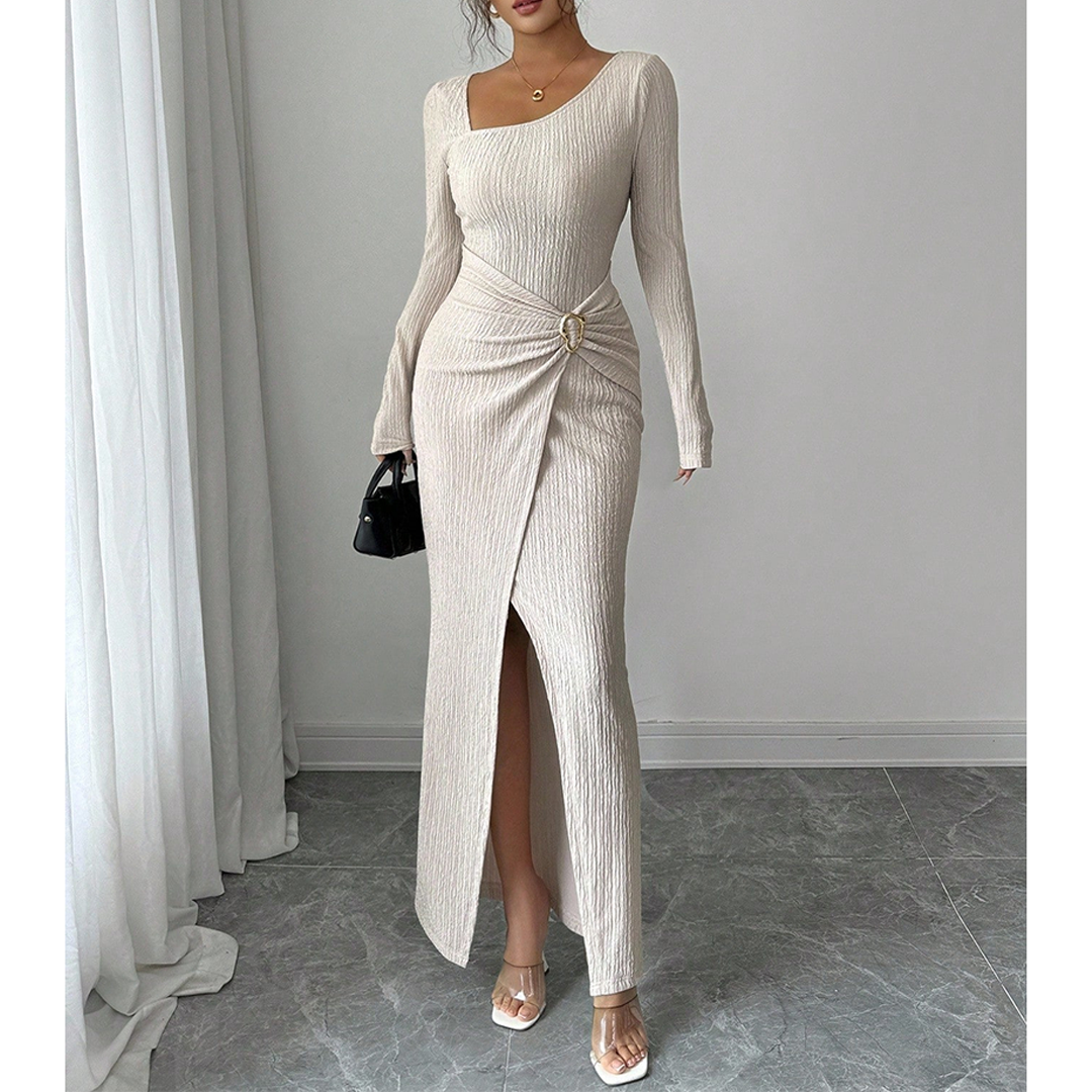 Robe à manches longues et col drapé sur le devant