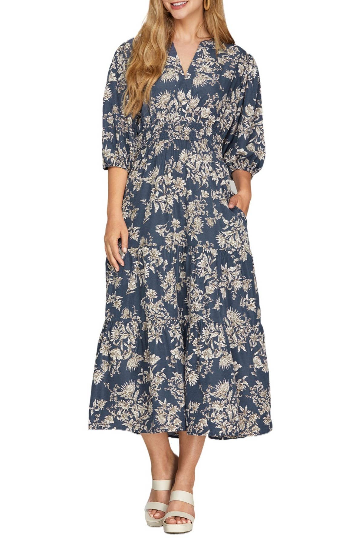 Cette robe est confectionnée en coton léger et présente une encolure ronde classique et des manches longues. Sa coupe ample est conçue pour apporter du confort, tandis que sa silhouette trapèze à plusieurs niveaux offre un effet amincissant et flatteur. Parfait pour un style à la fois décontracté et élégant.