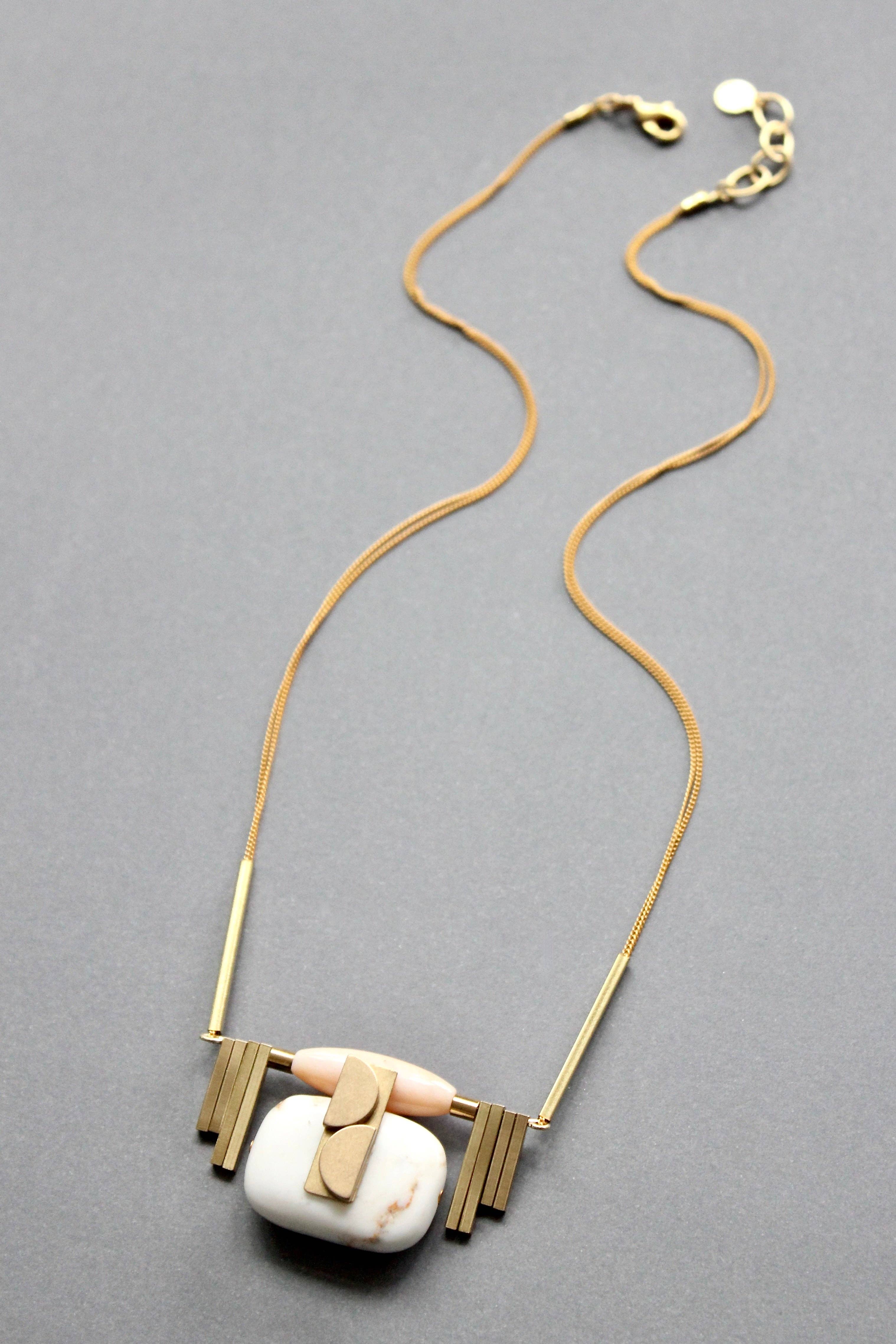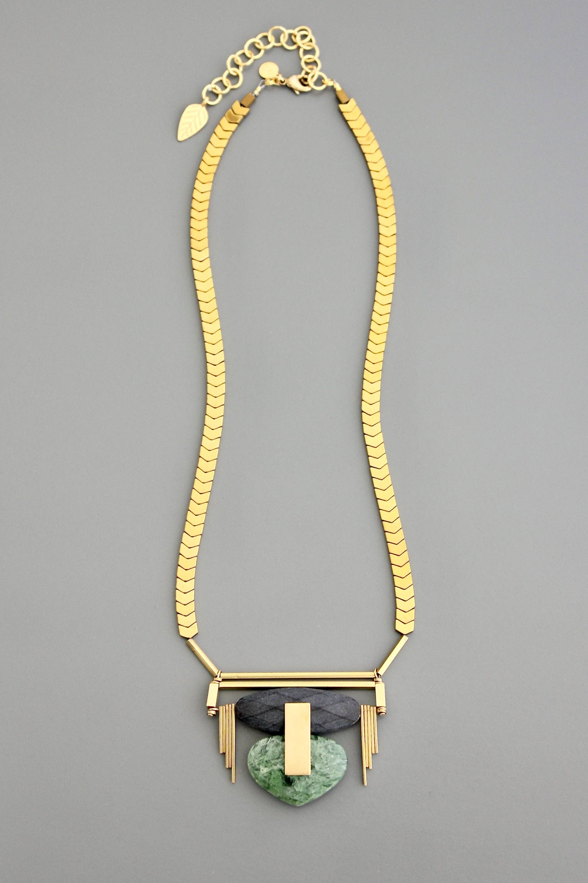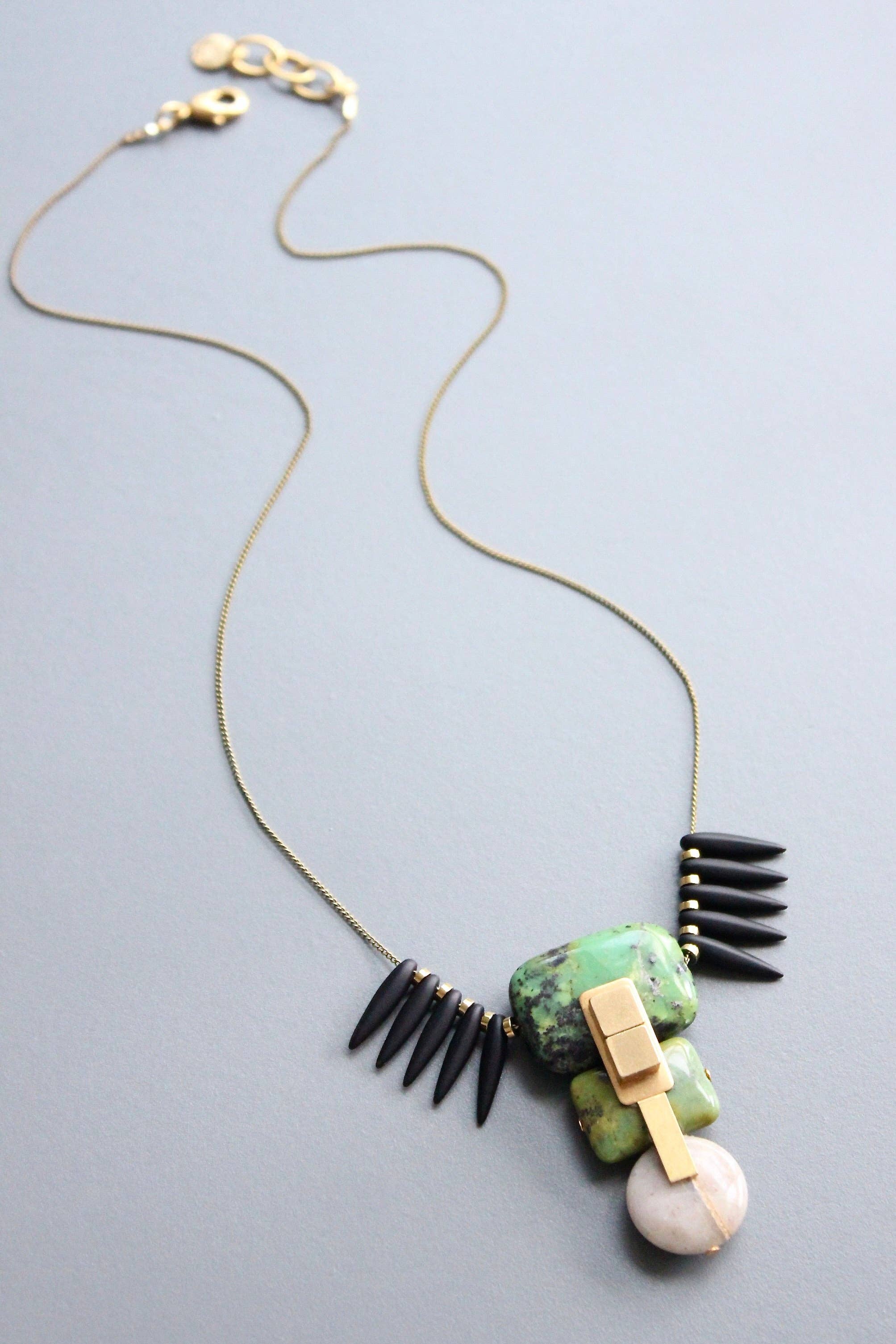 Crochets en laiton plaqué or 18 carats avec vinyle vert, magnésite grise et howlite synthétique. Chaque demi-paire pèse 0,32 oz et mesure 3,75 pouces.